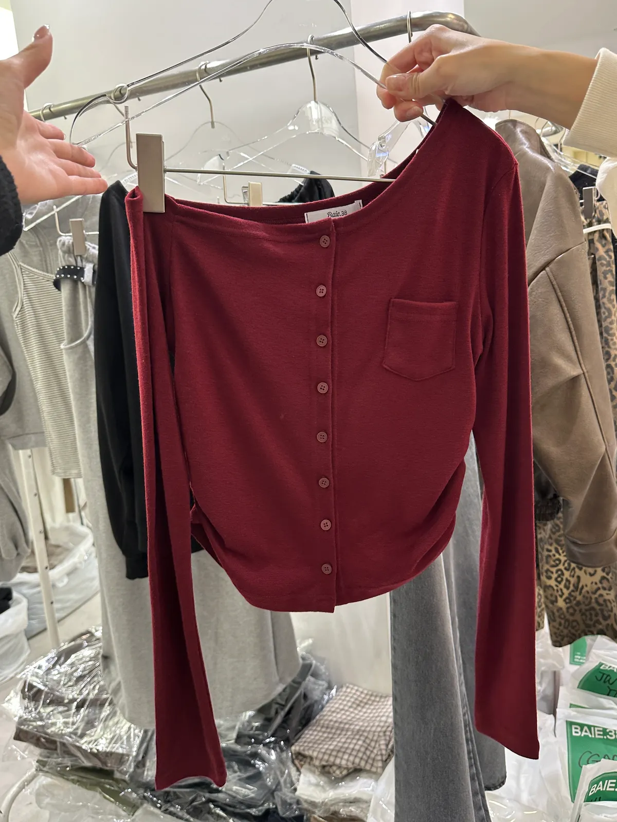 韓國斜肩側抓皺口袋棉上衣