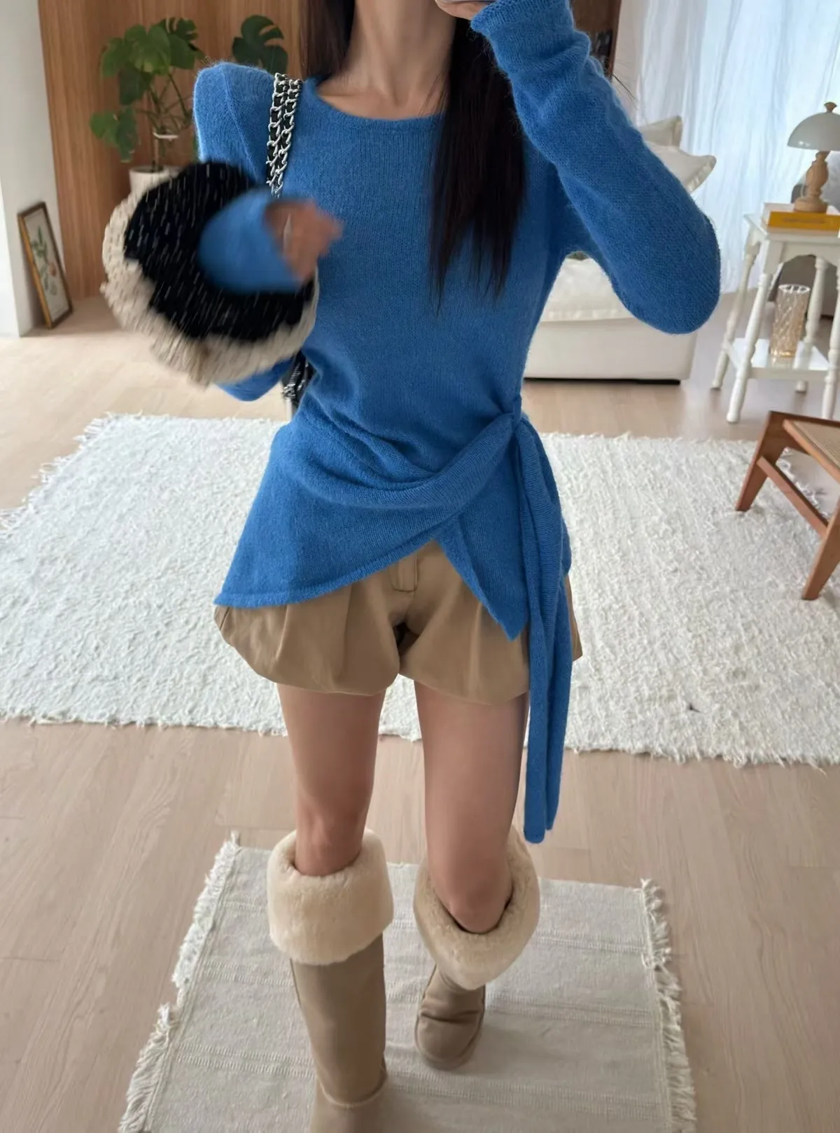 韓國墊肩下擺不規則交叉毛料上衣