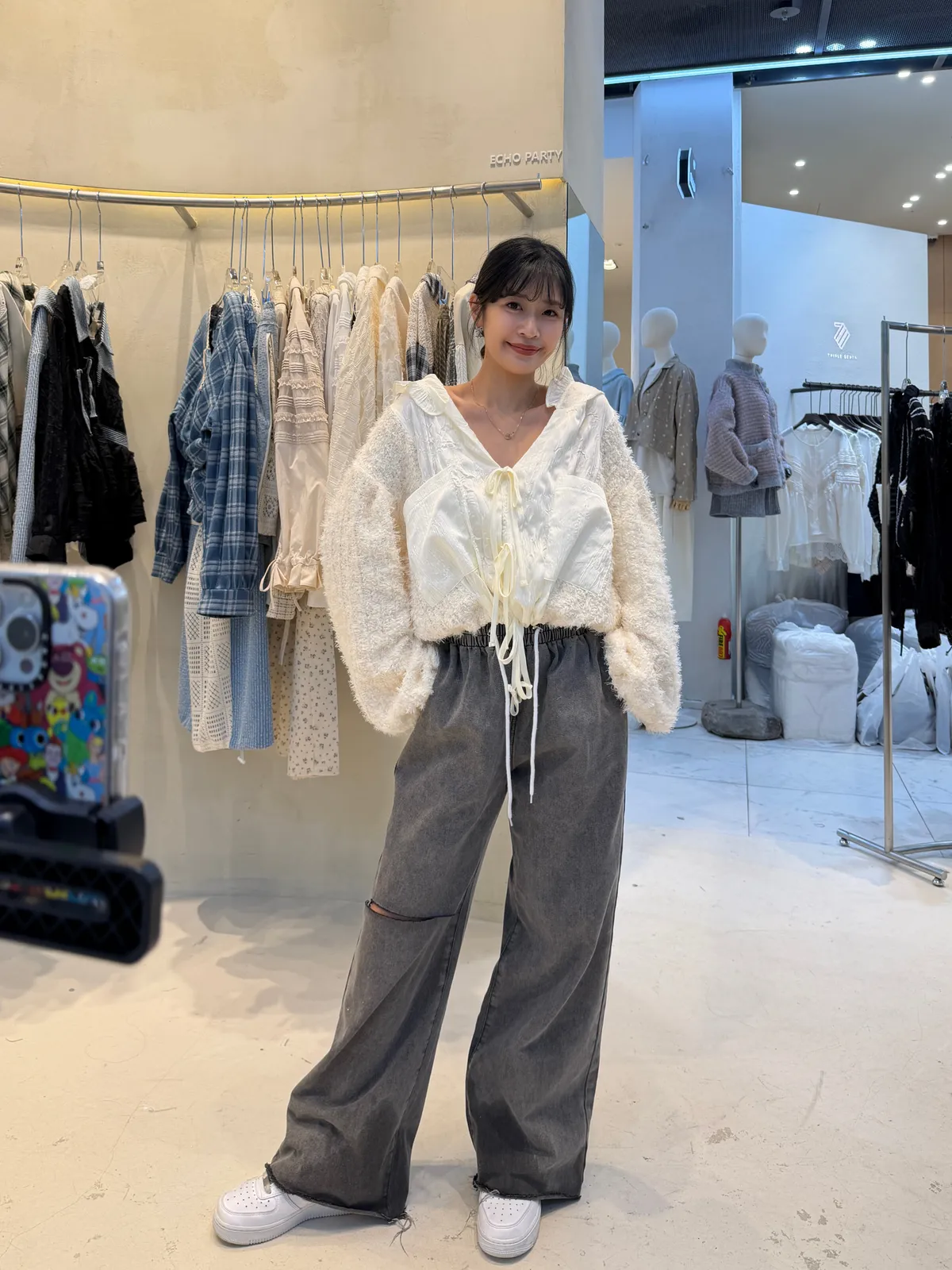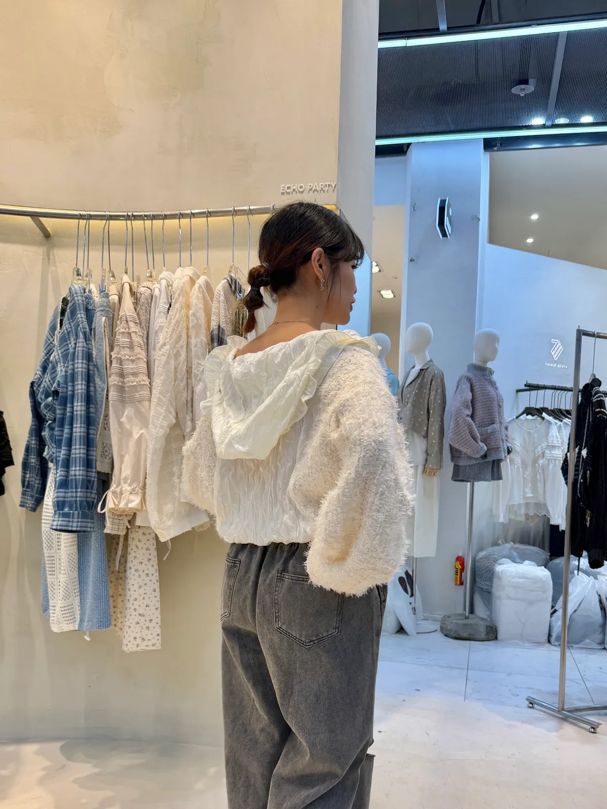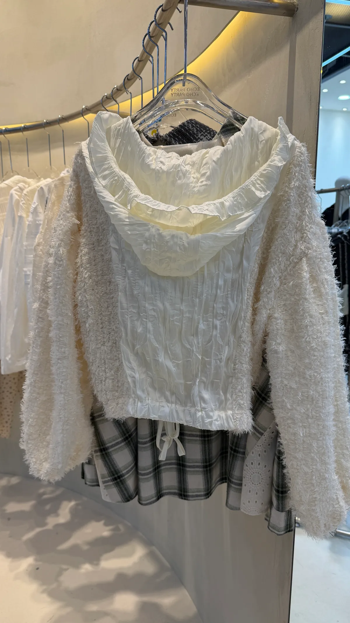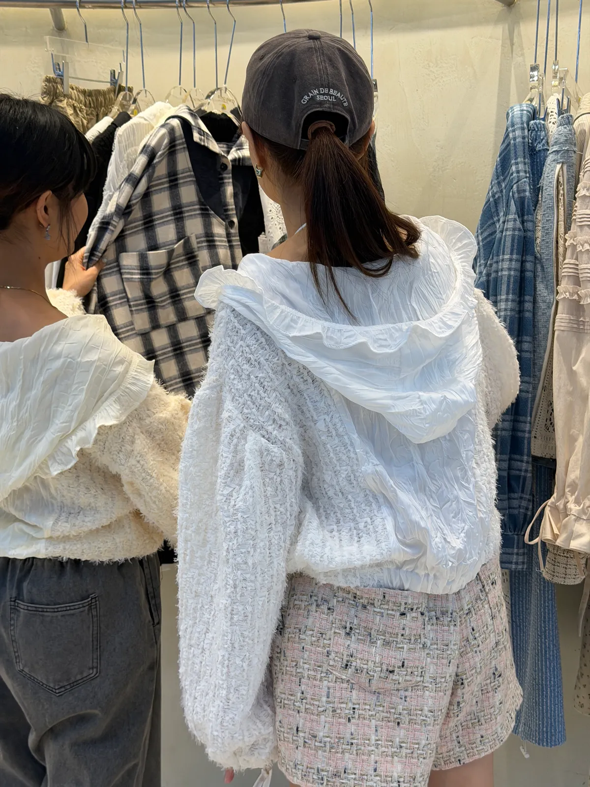 韓國荷葉拼接勾織毛毛鬚連帽上衣