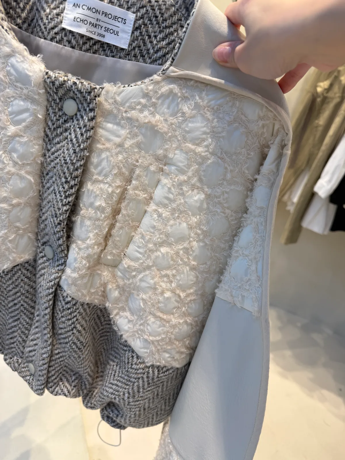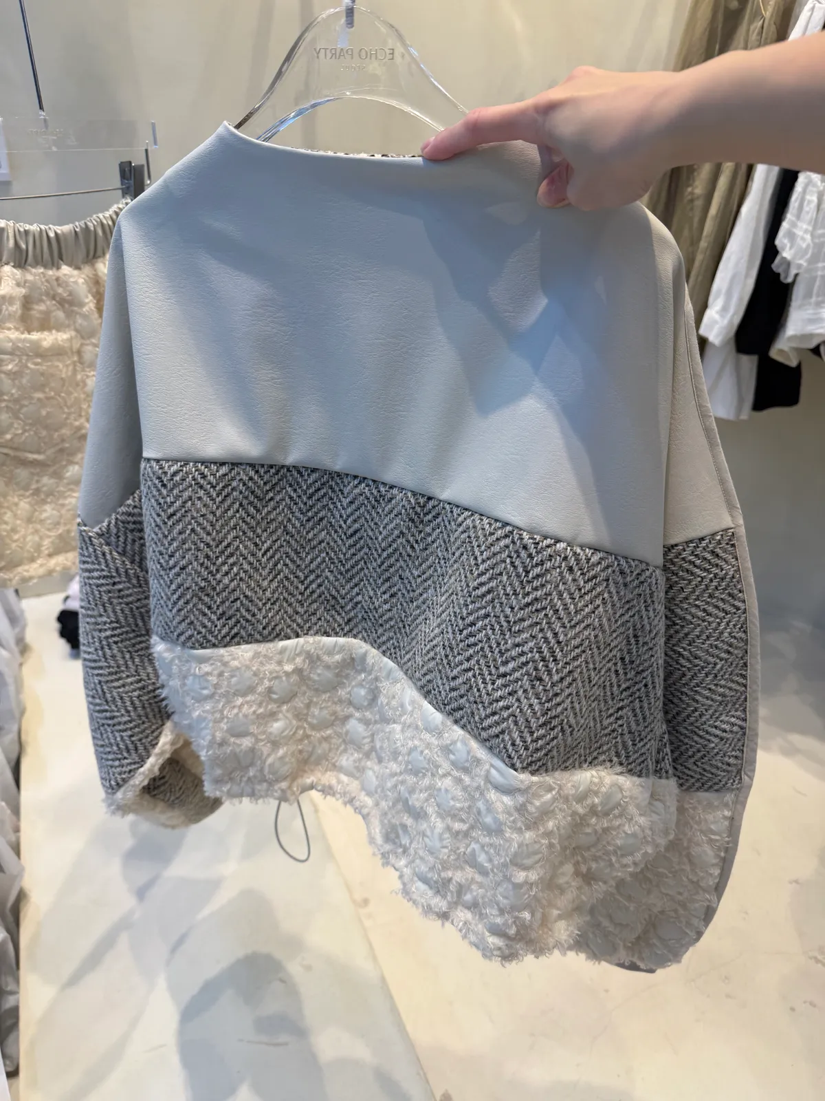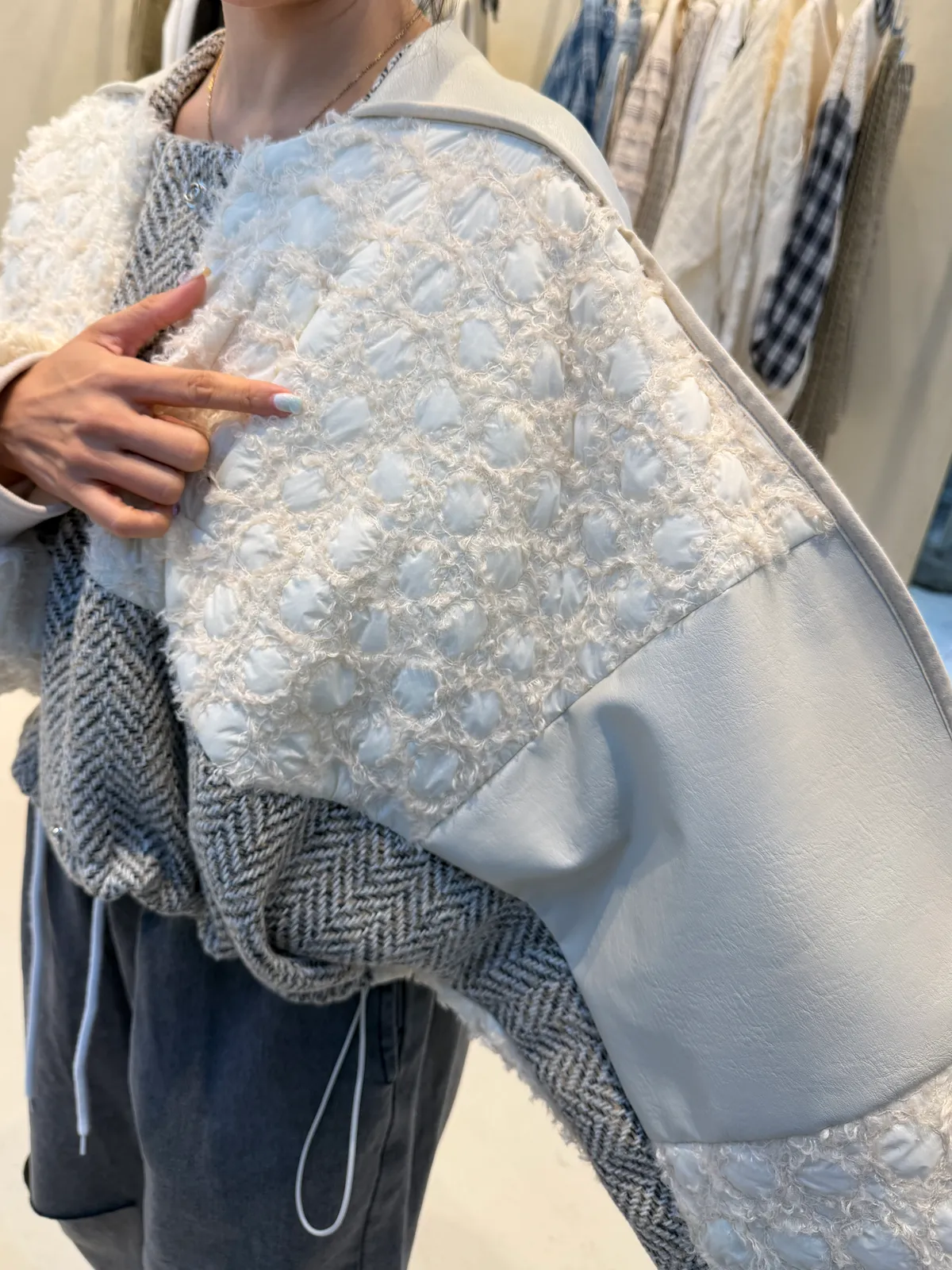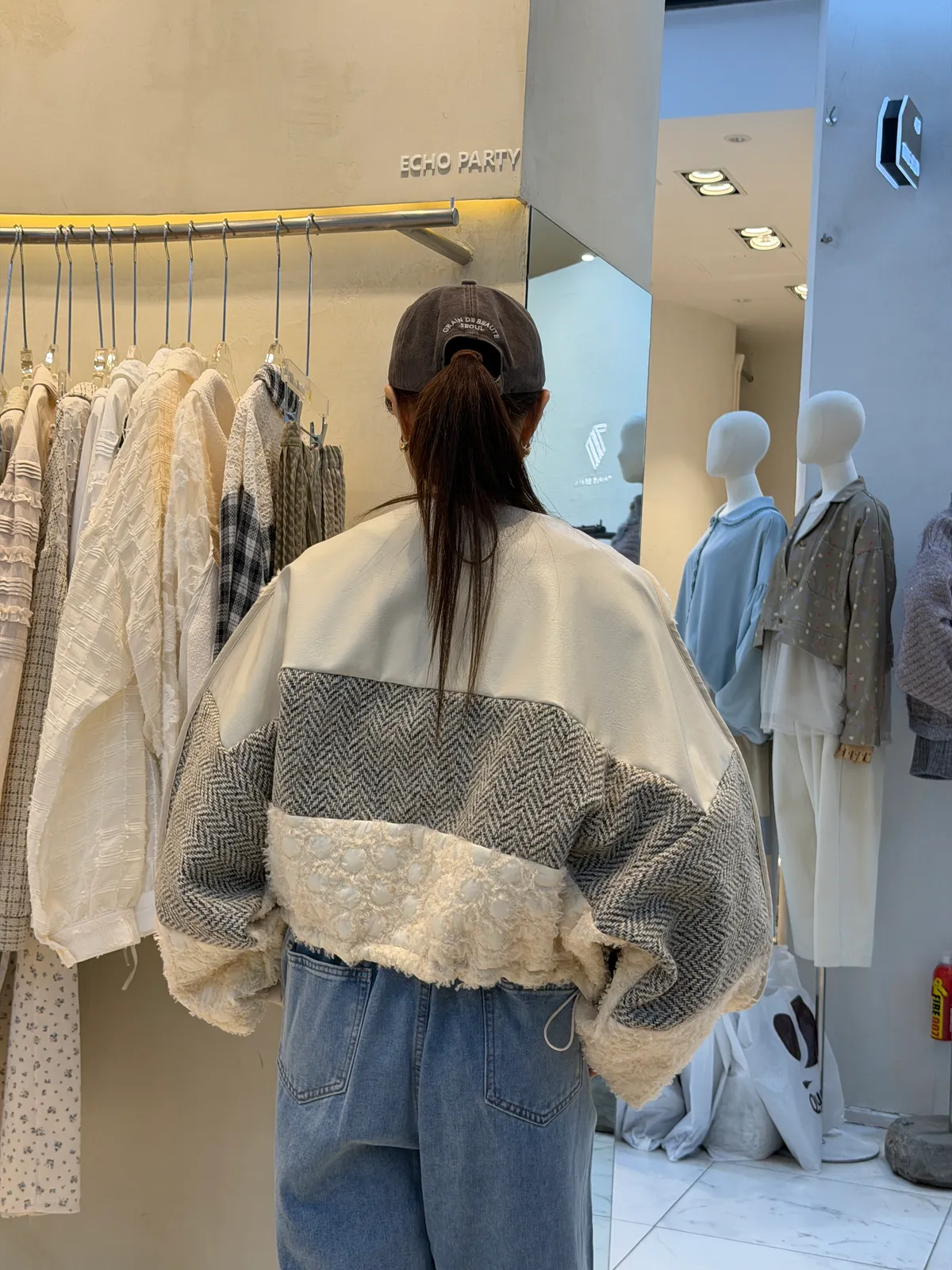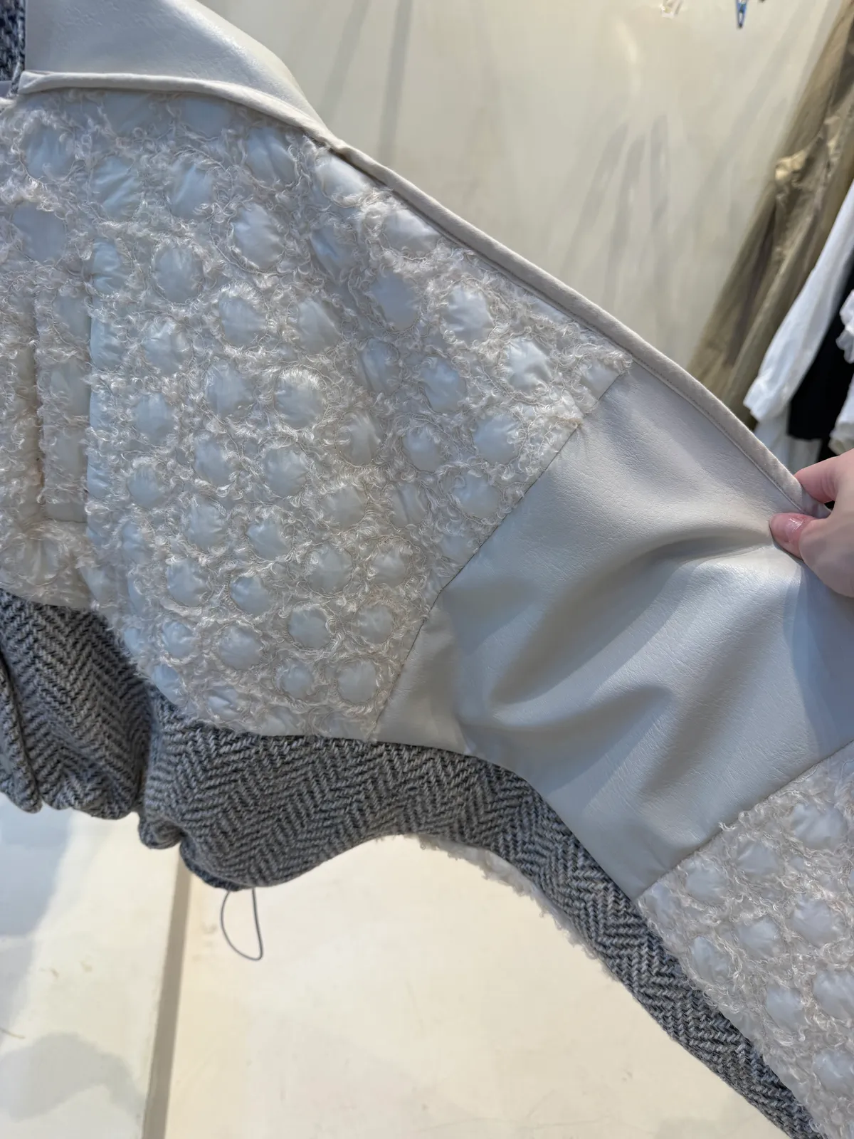 韓國綿羊鬚拼接皮革絎縫毛呢外套