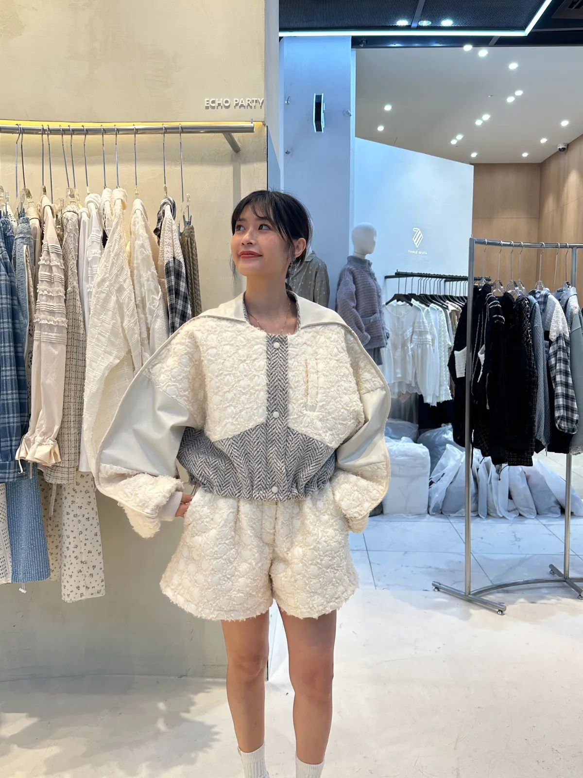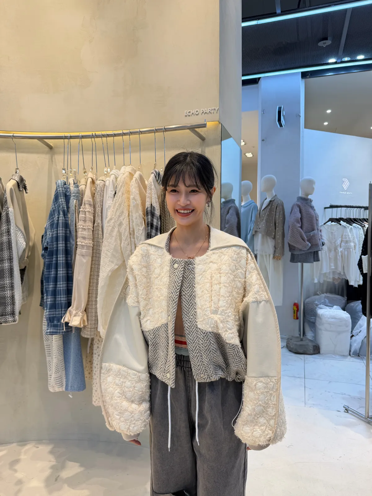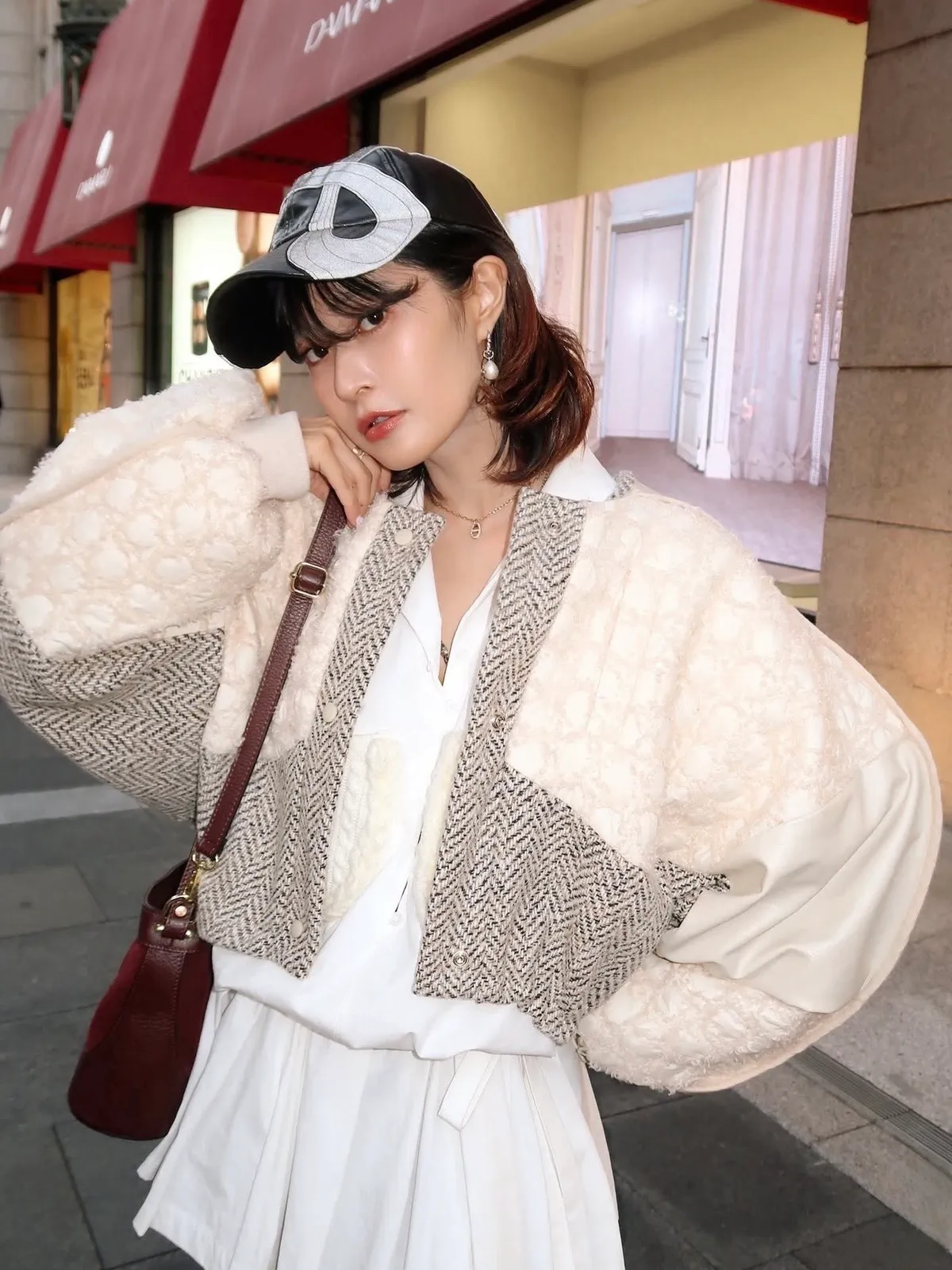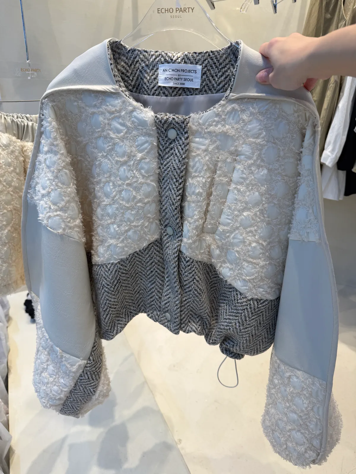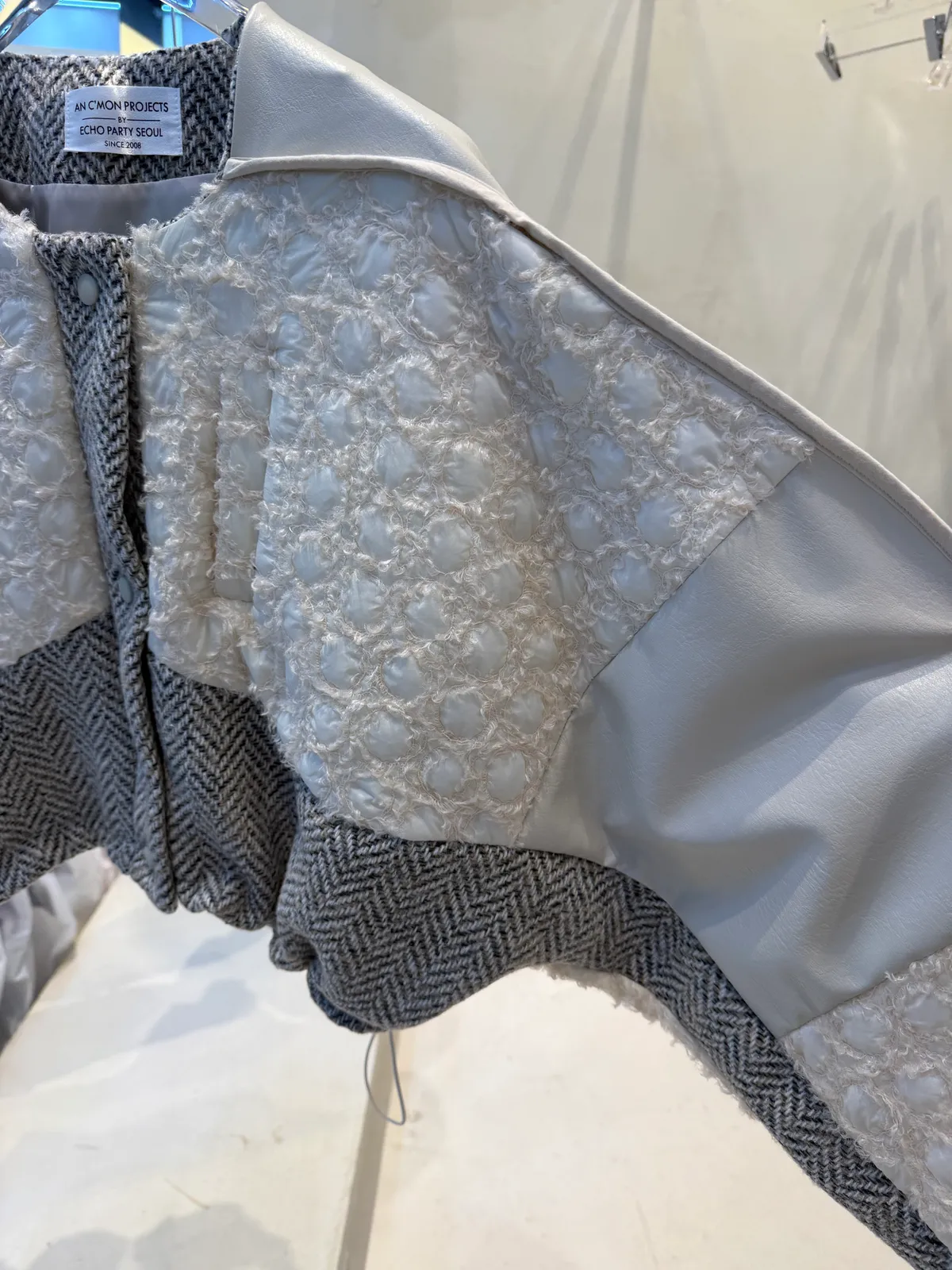 韓國綿羊鬚拼接皮革絎縫毛呢外套