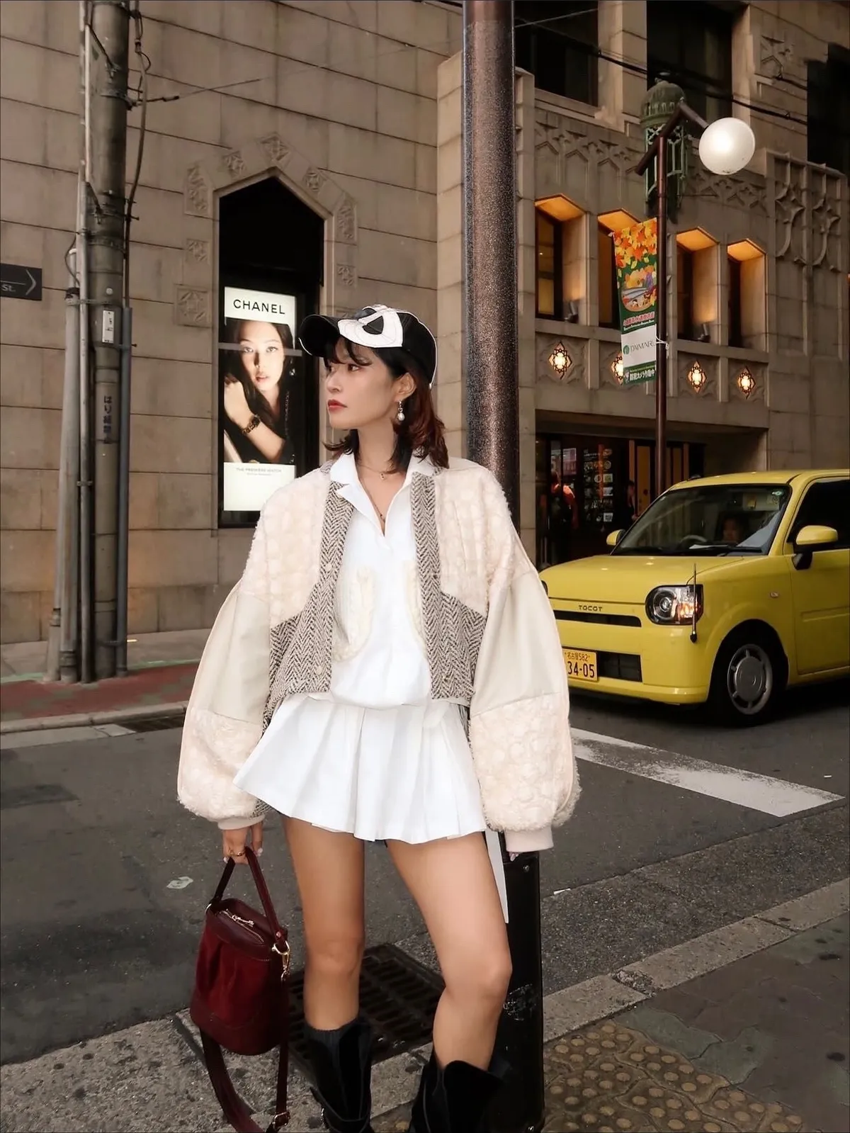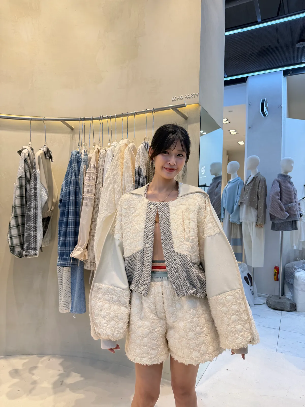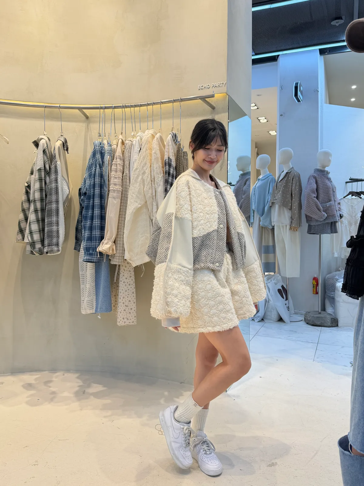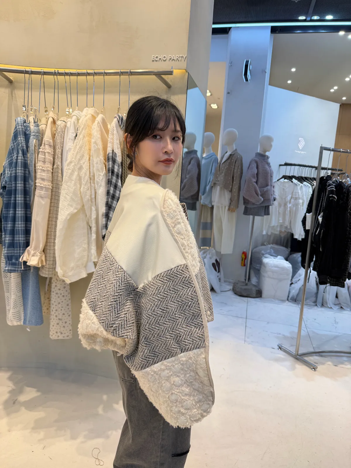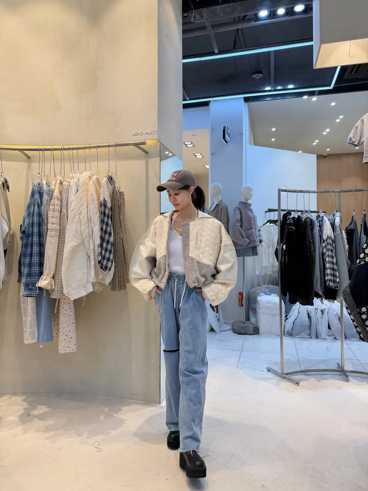 韓國綿羊鬚拼接皮革絎縫毛呢外套