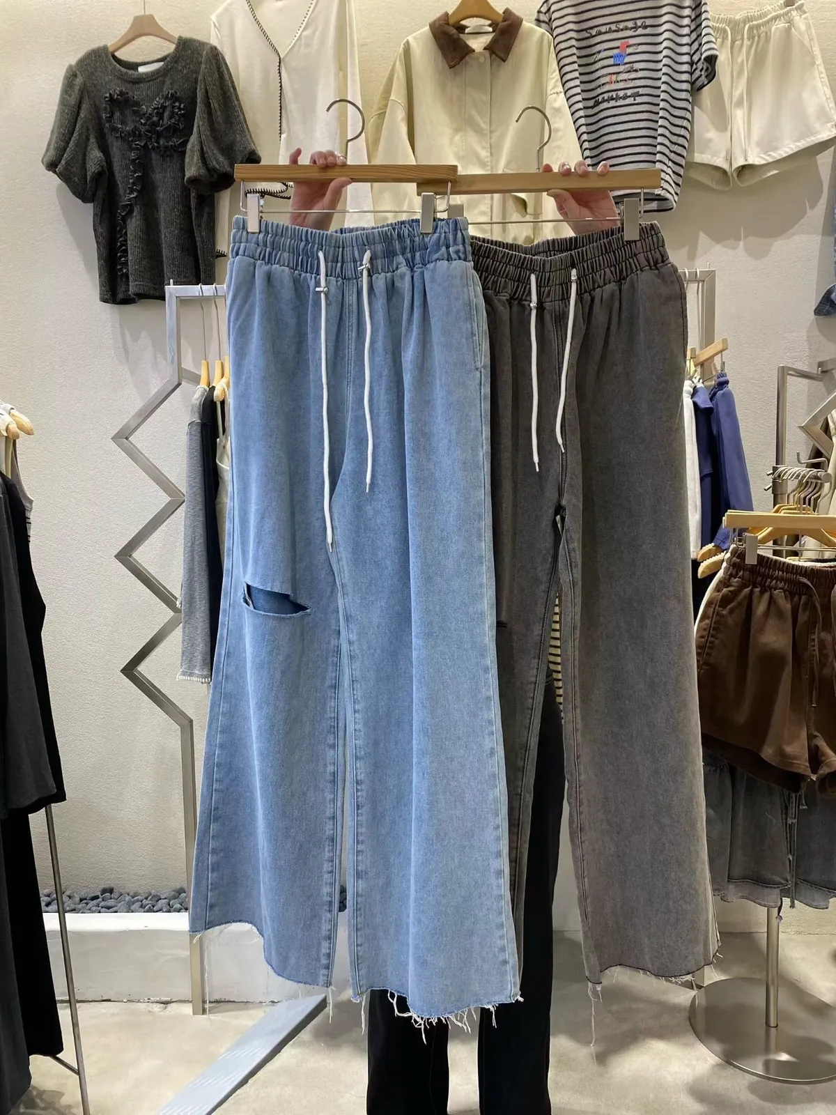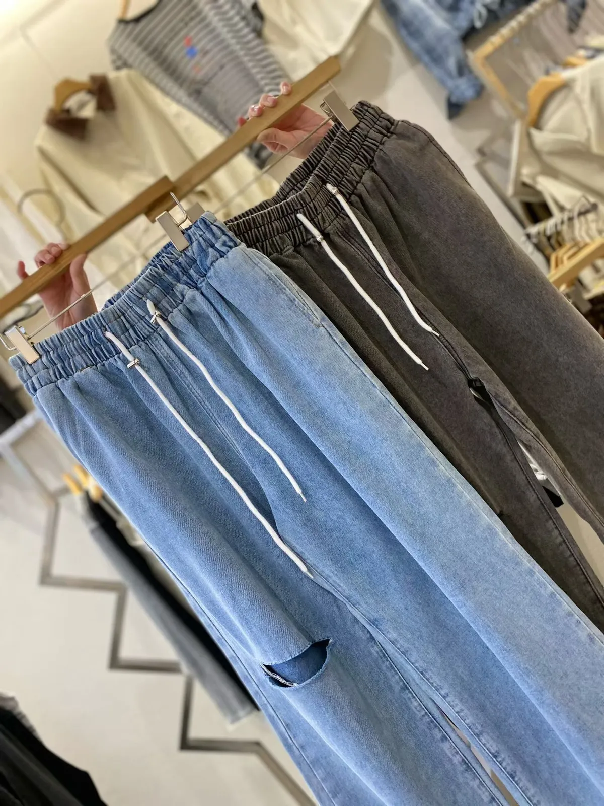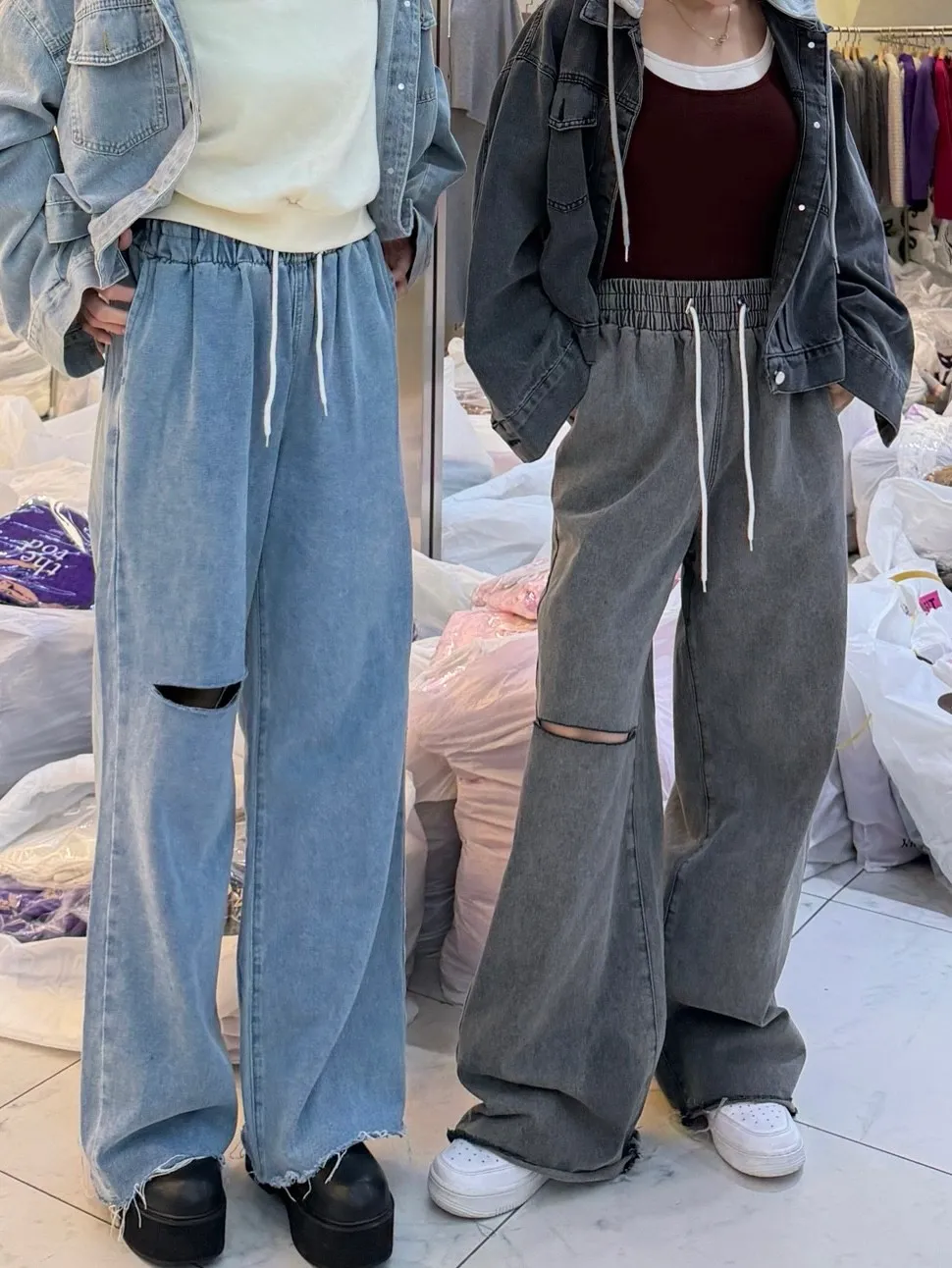韓國腰頭鬆緊刮破造型牛仔寬褲