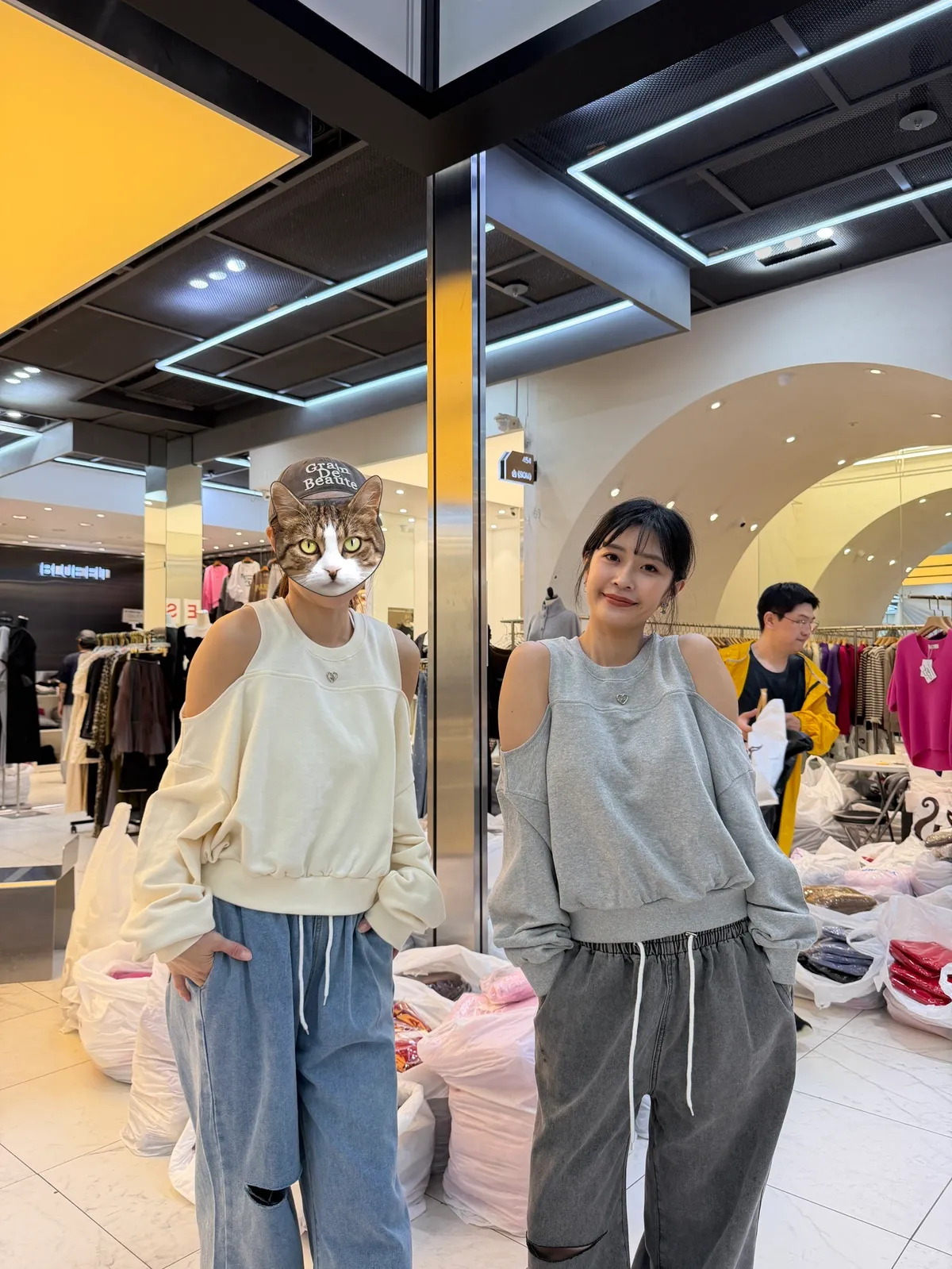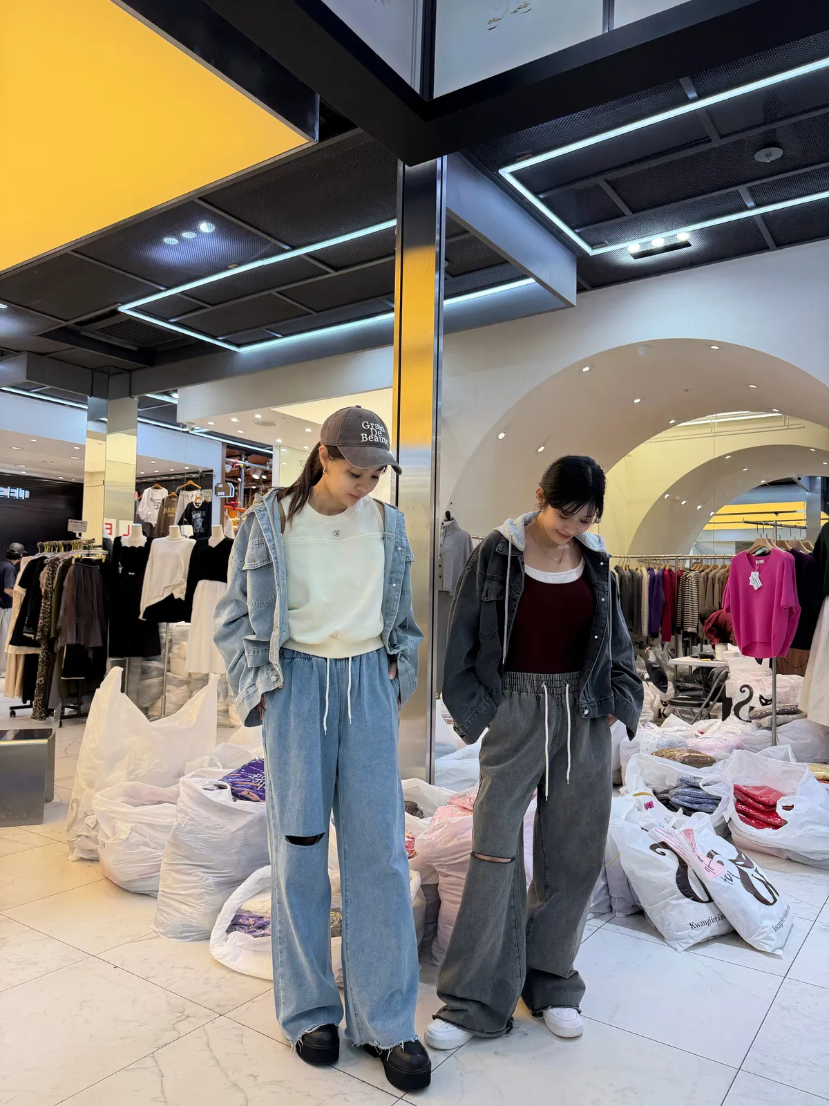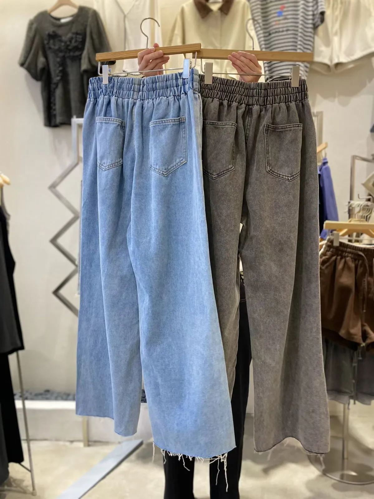 韓國腰頭鬆緊刮破造型牛仔寬褲