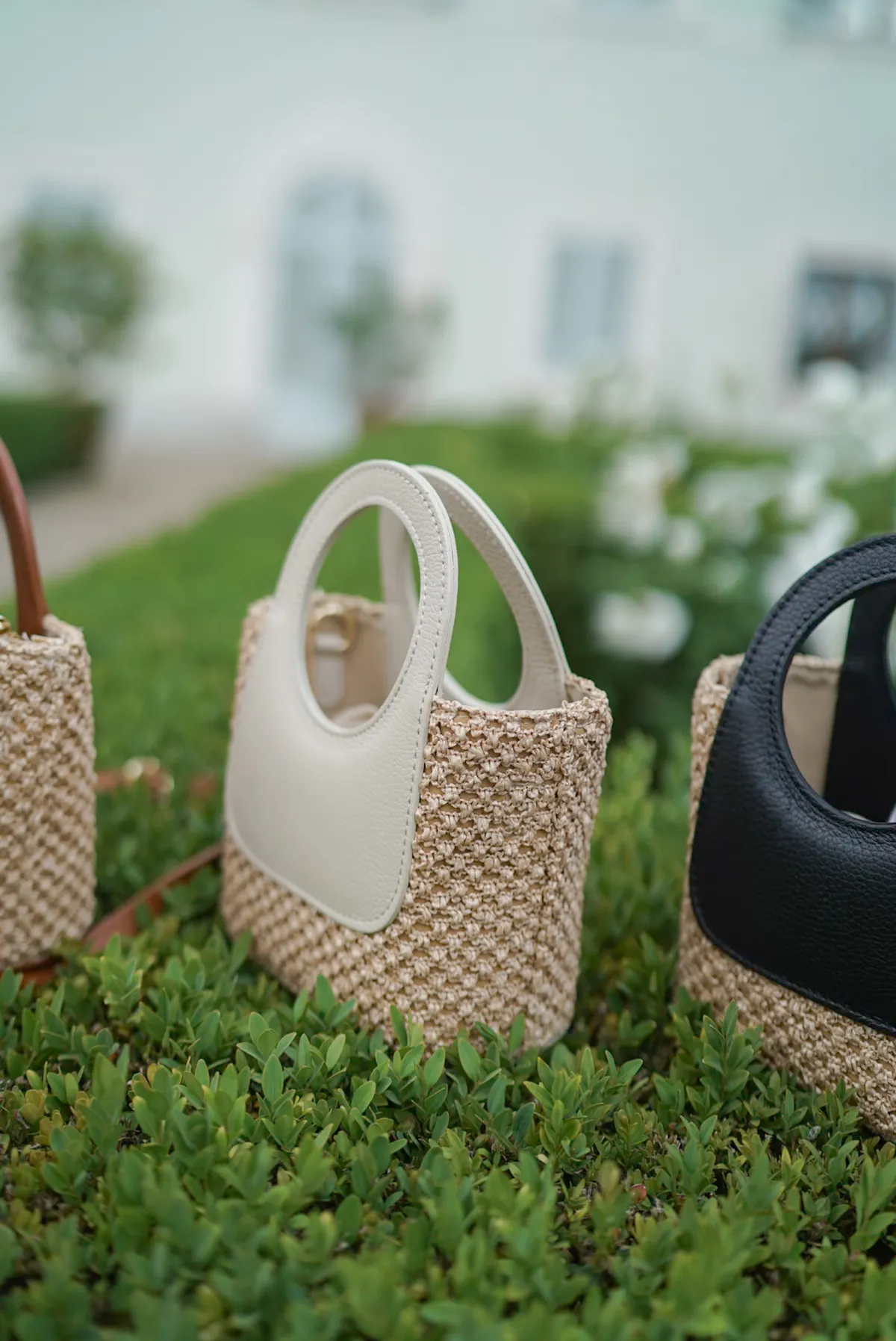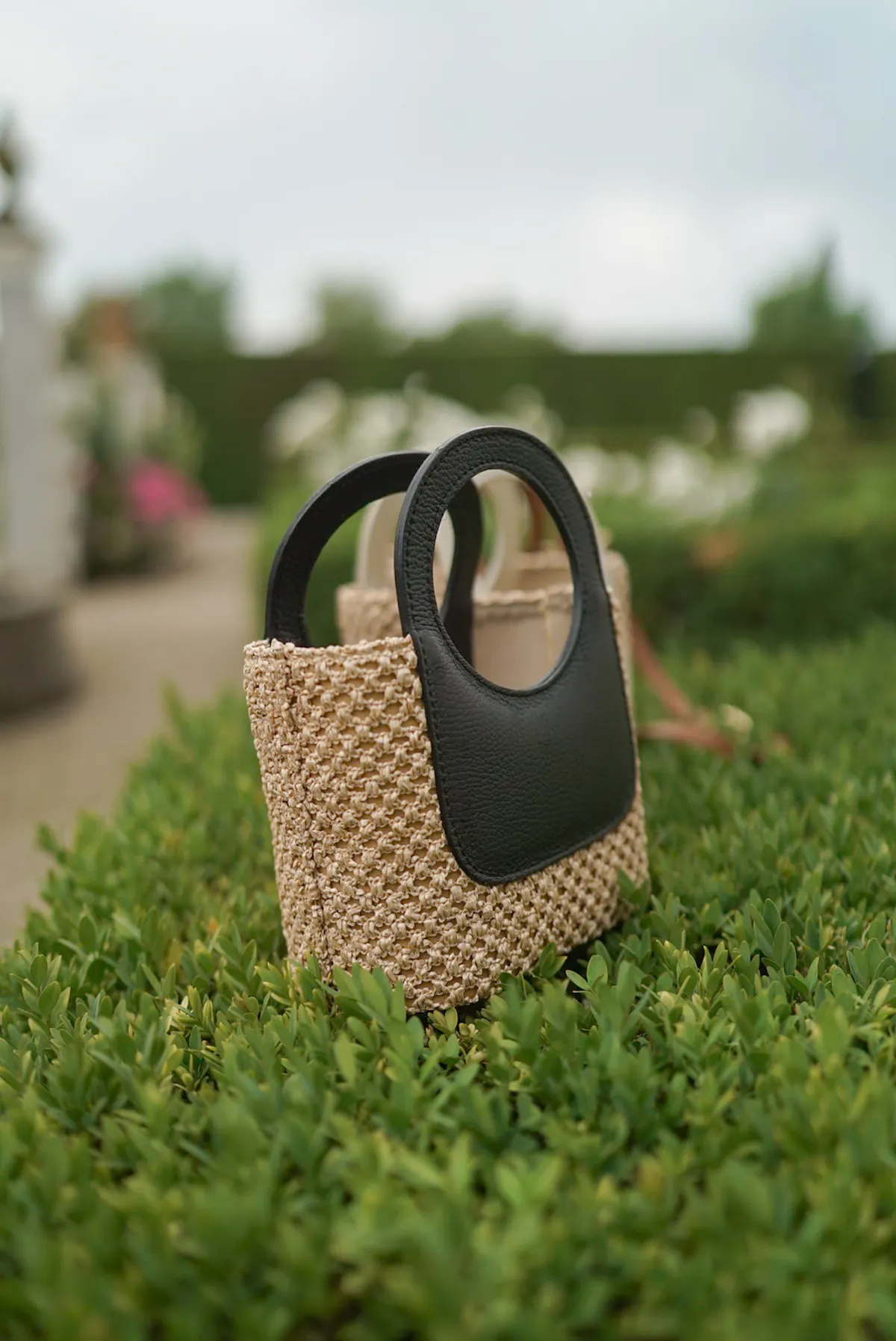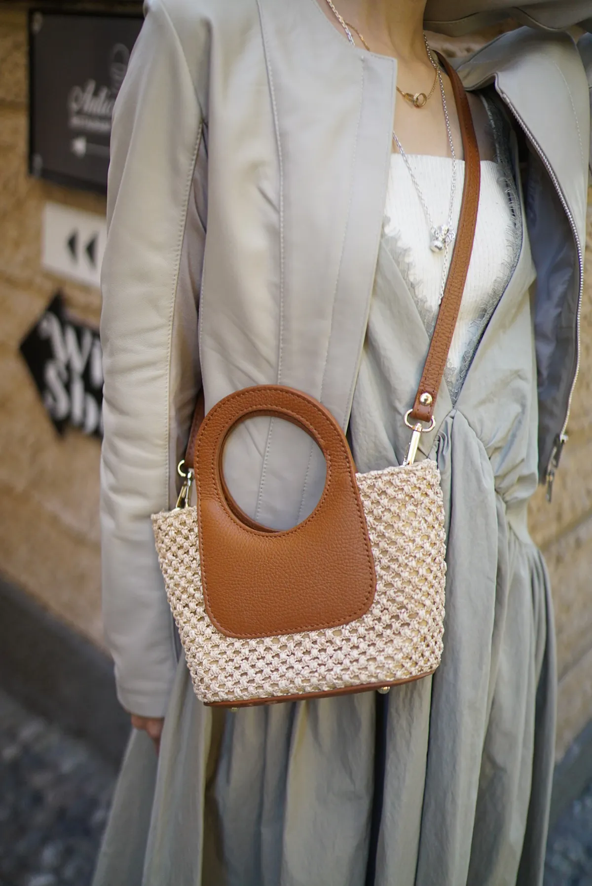 義大利製真皮提把造型藤編小包