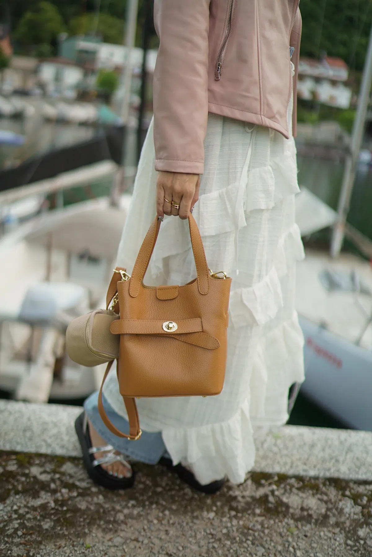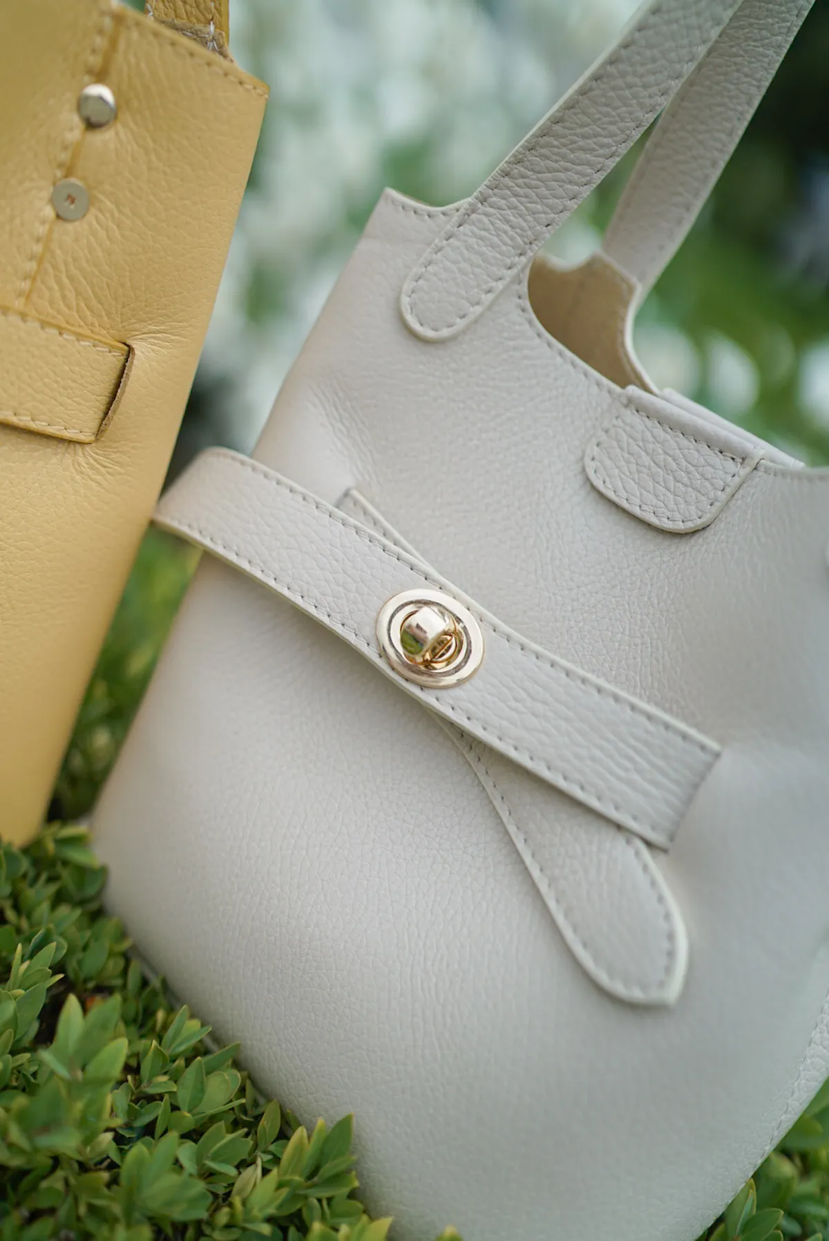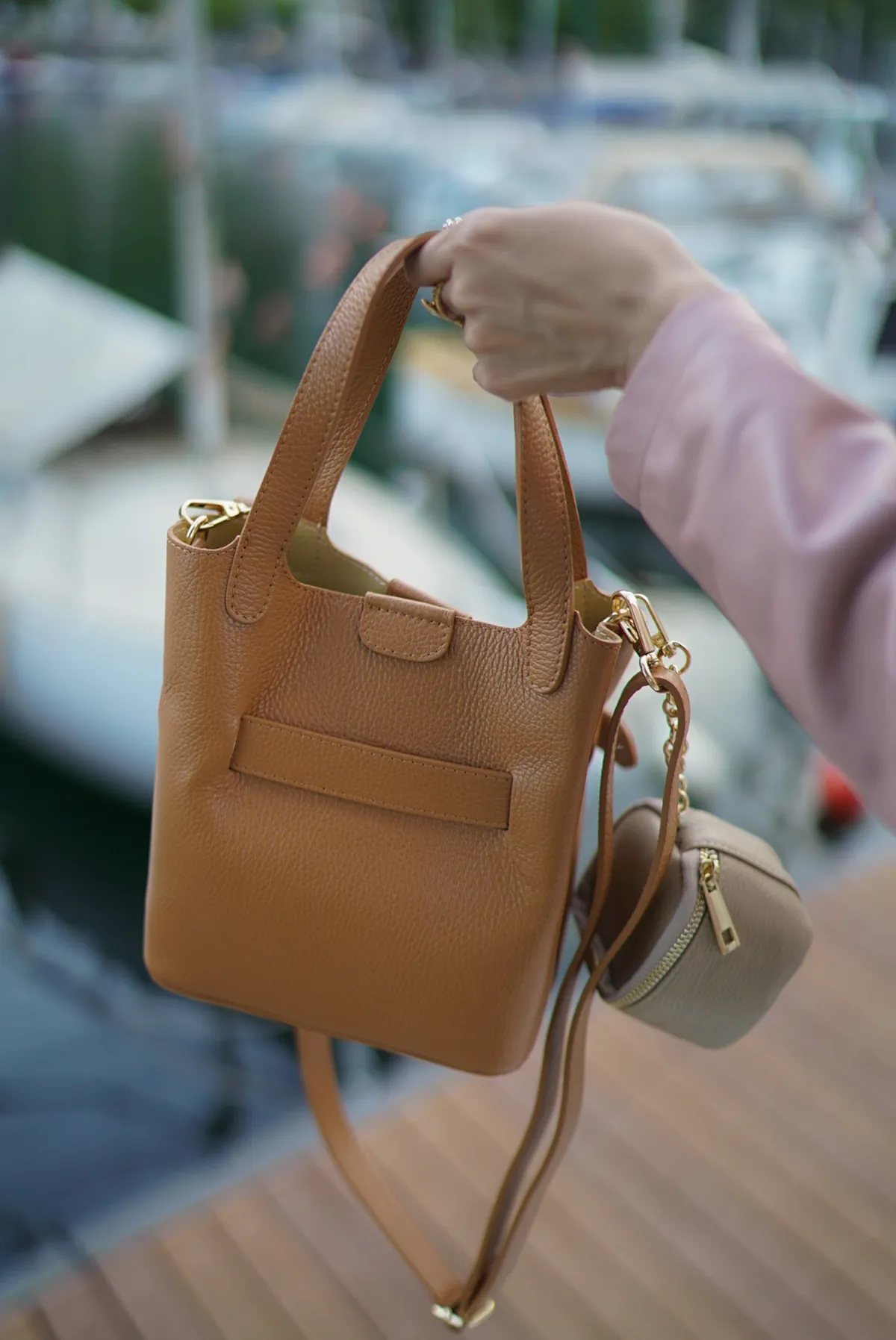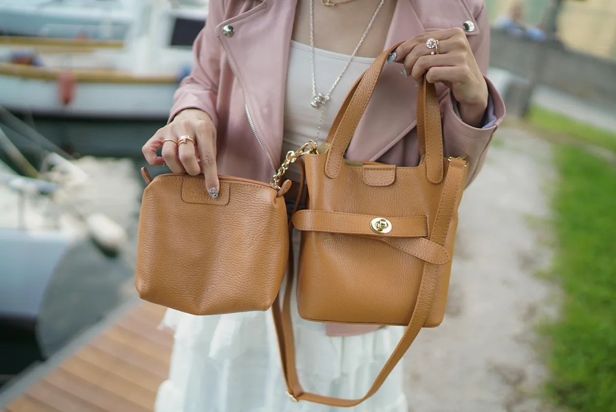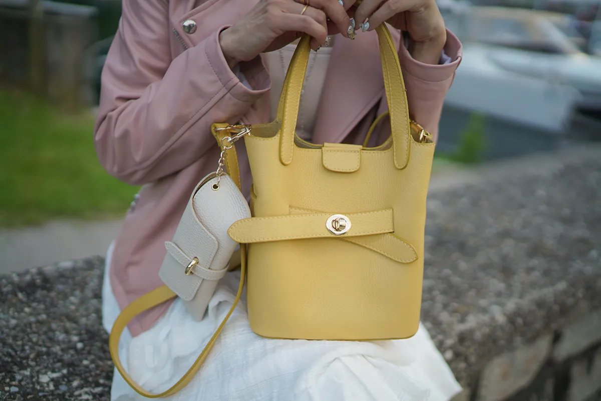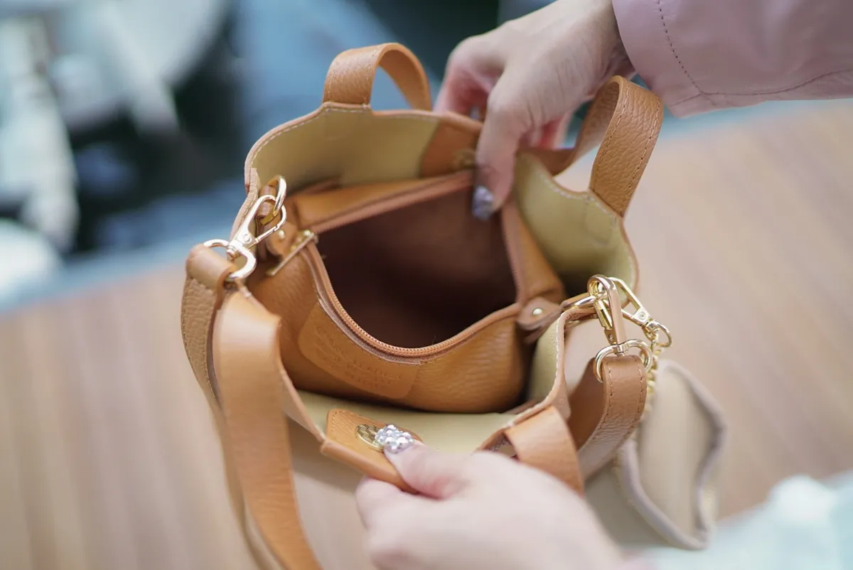 M042義大利製轉釦交叉造型水桶包2680元