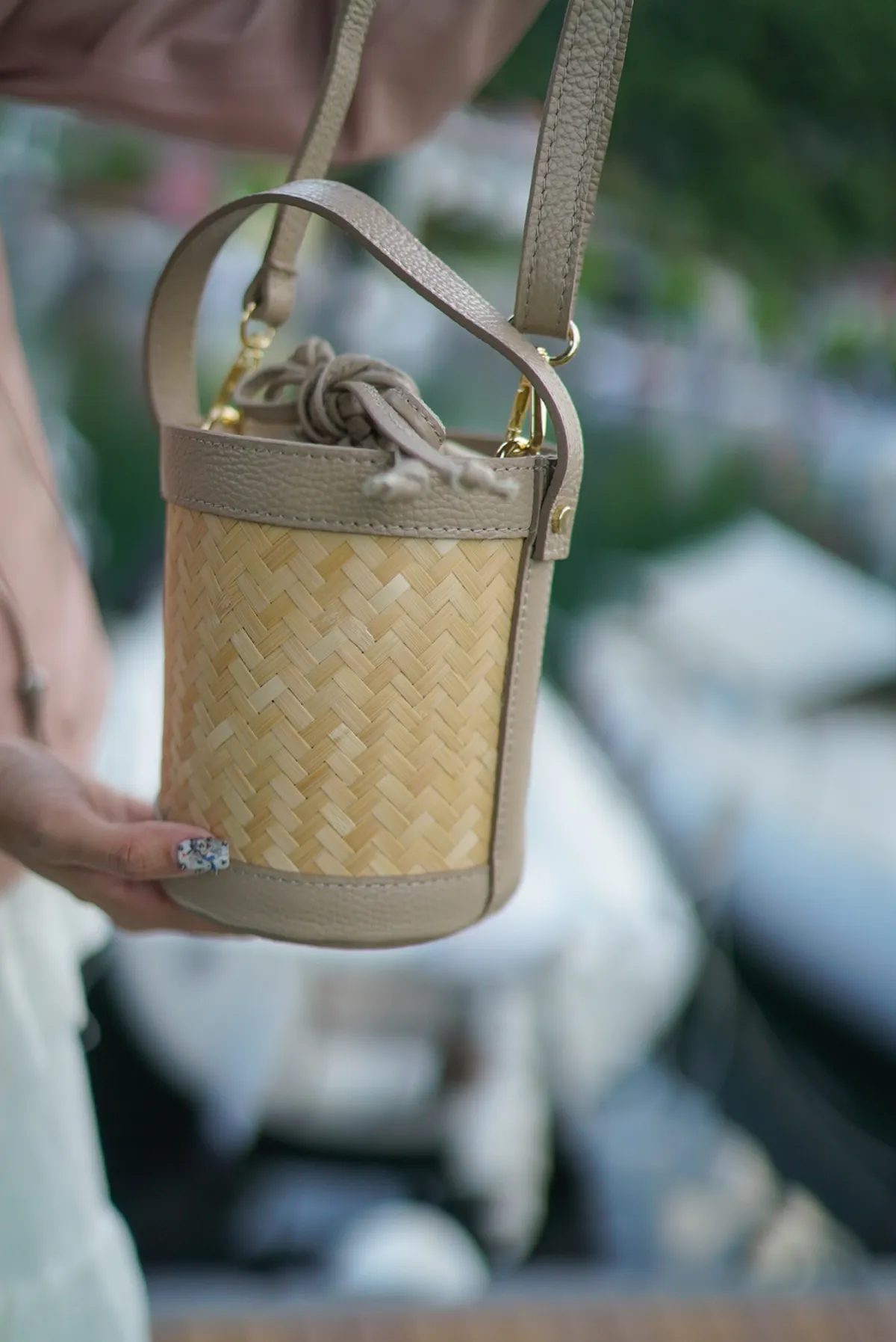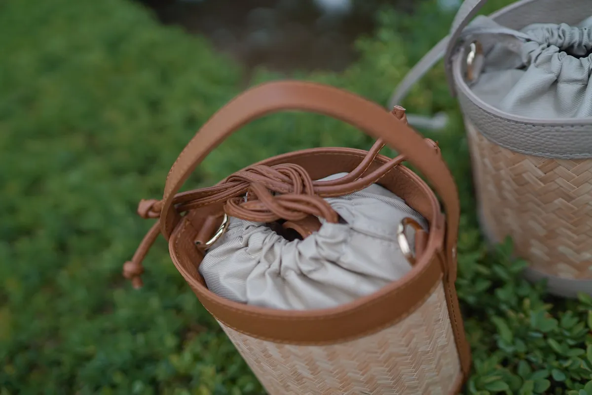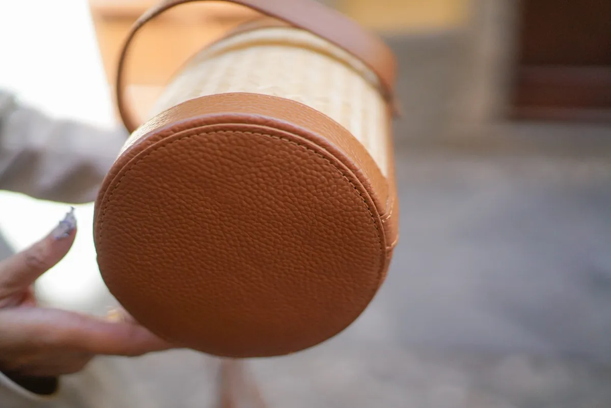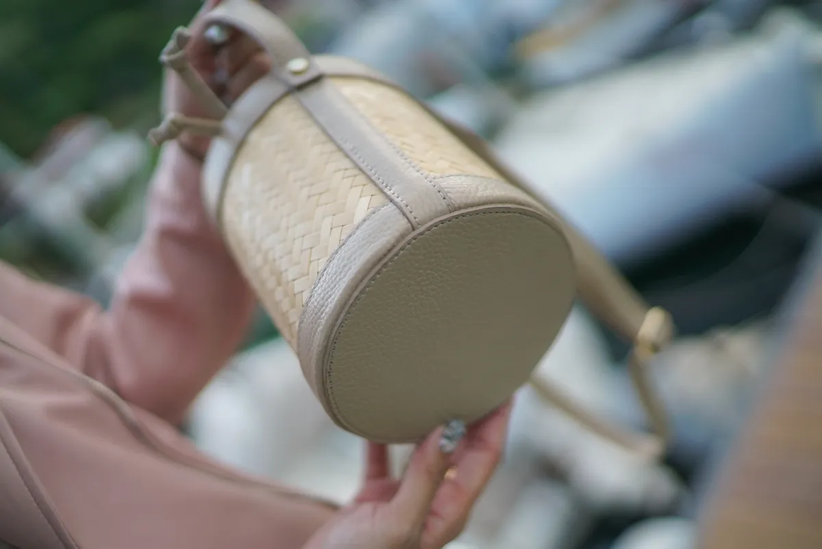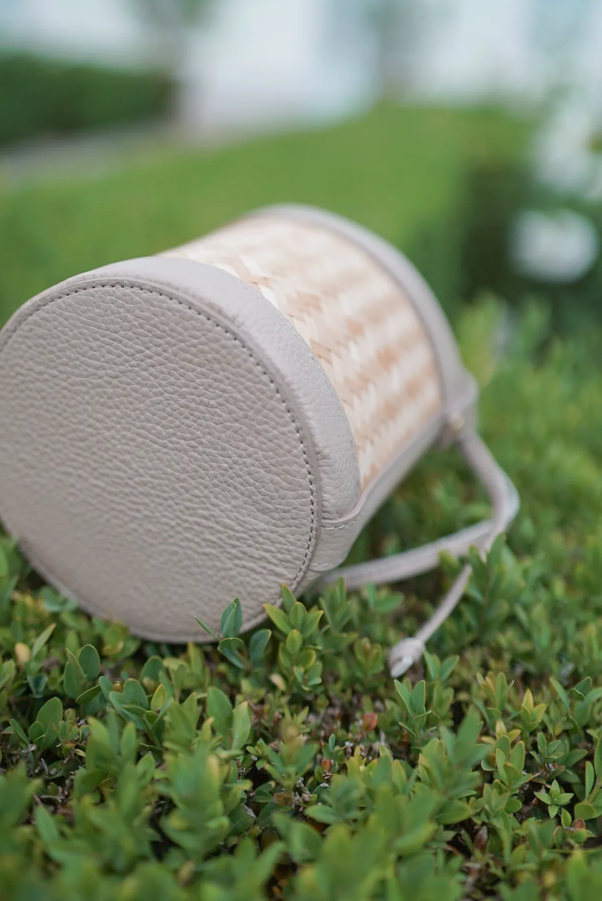 M044義大利製藤編拼接牛皮圓筒包2680元