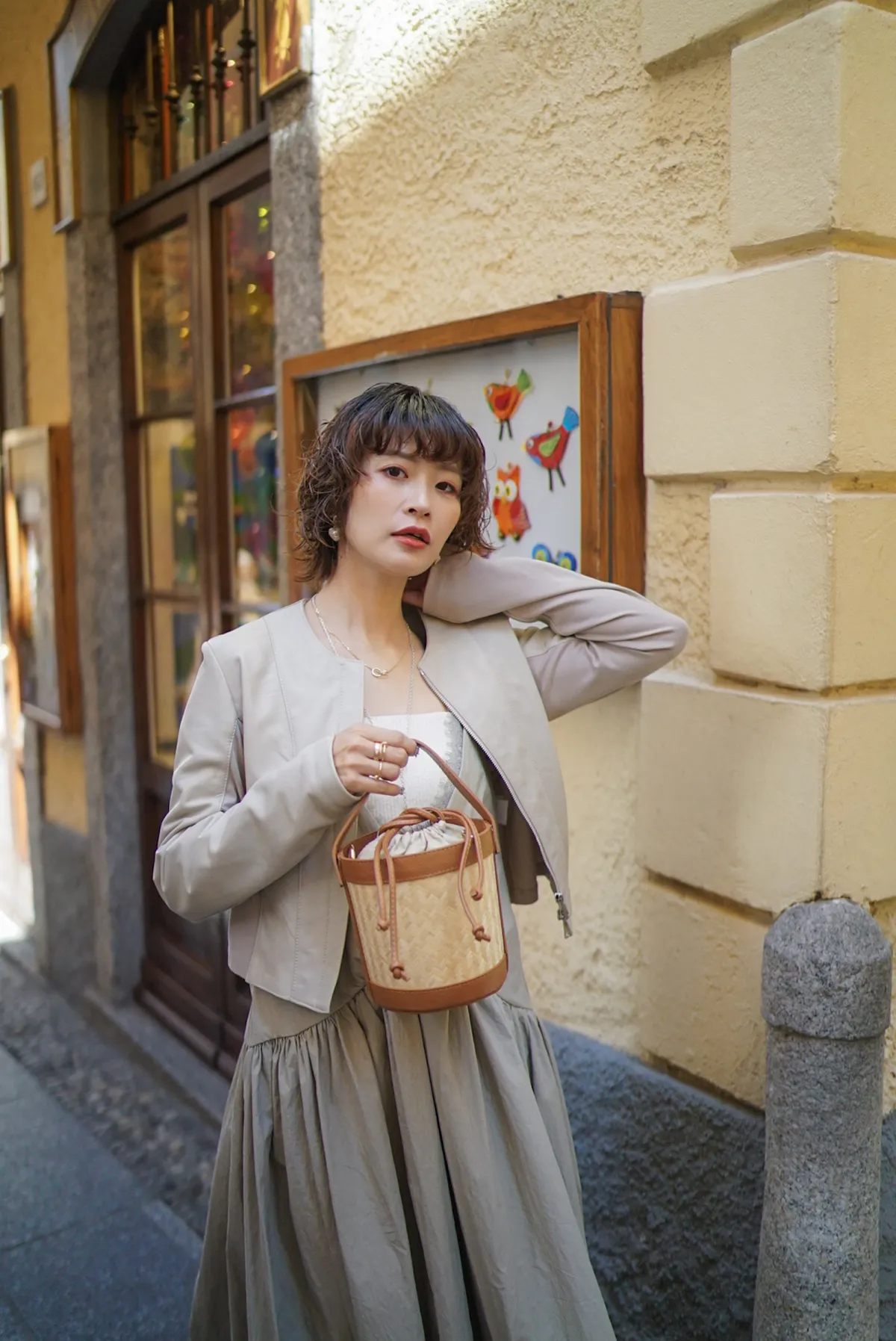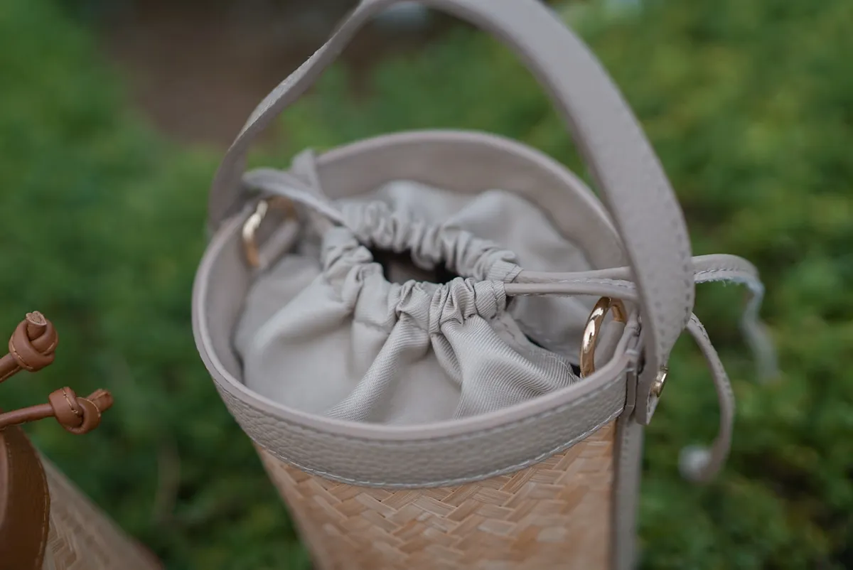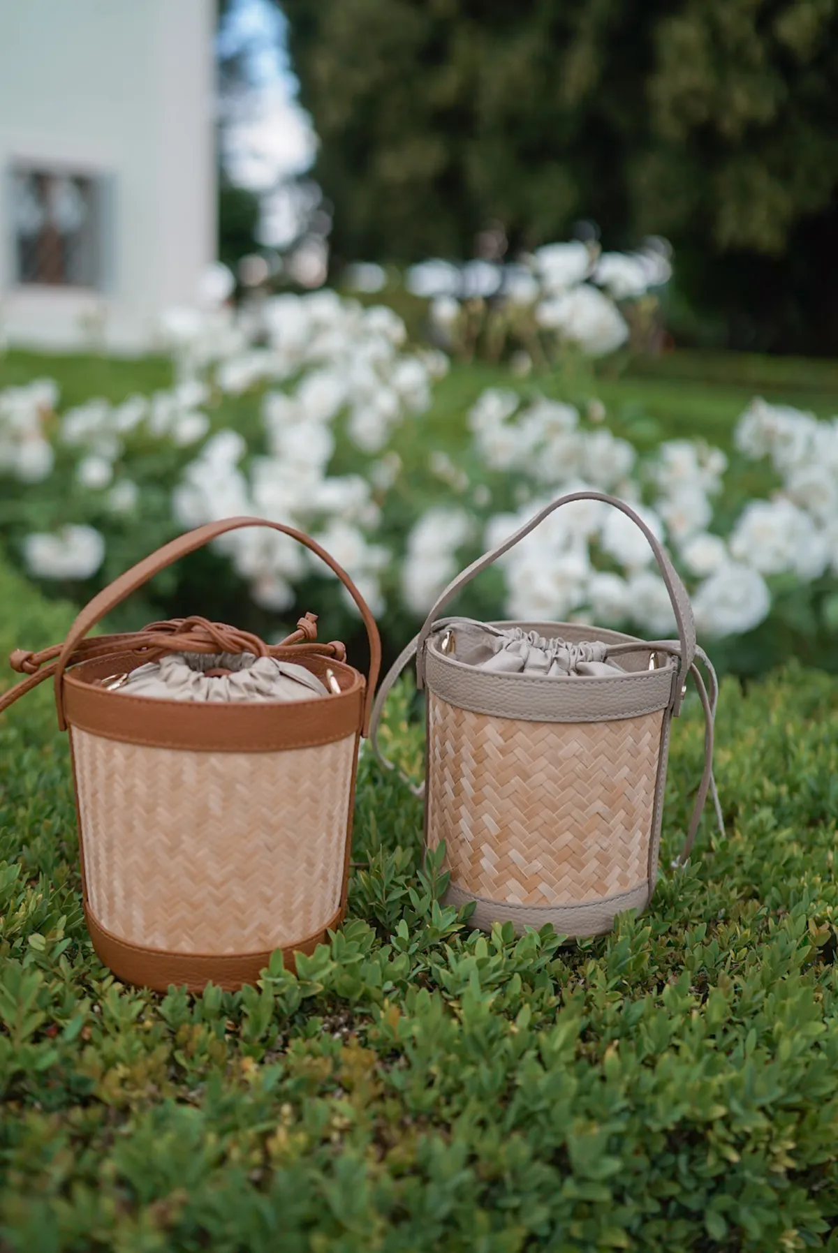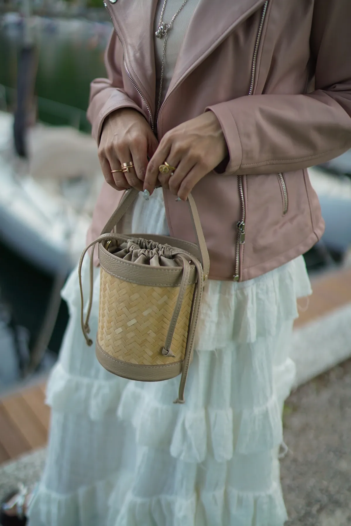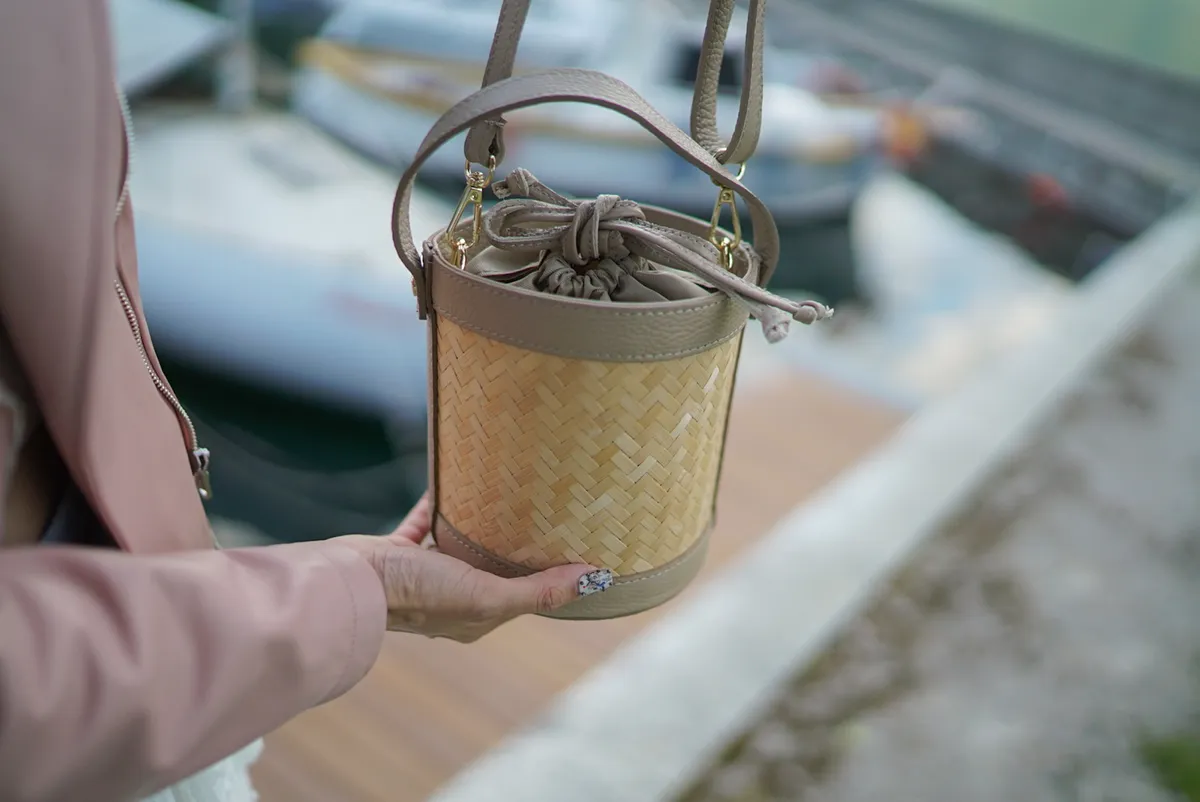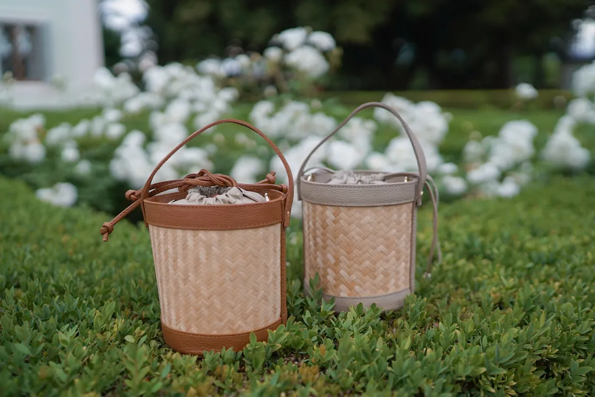 M044義大利製藤編拼接牛皮圓筒包2680元