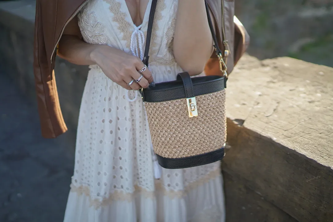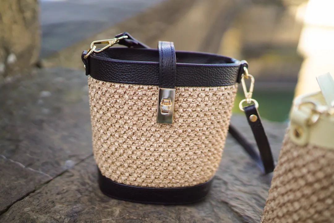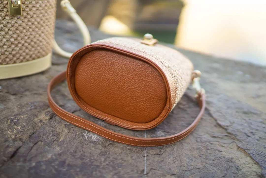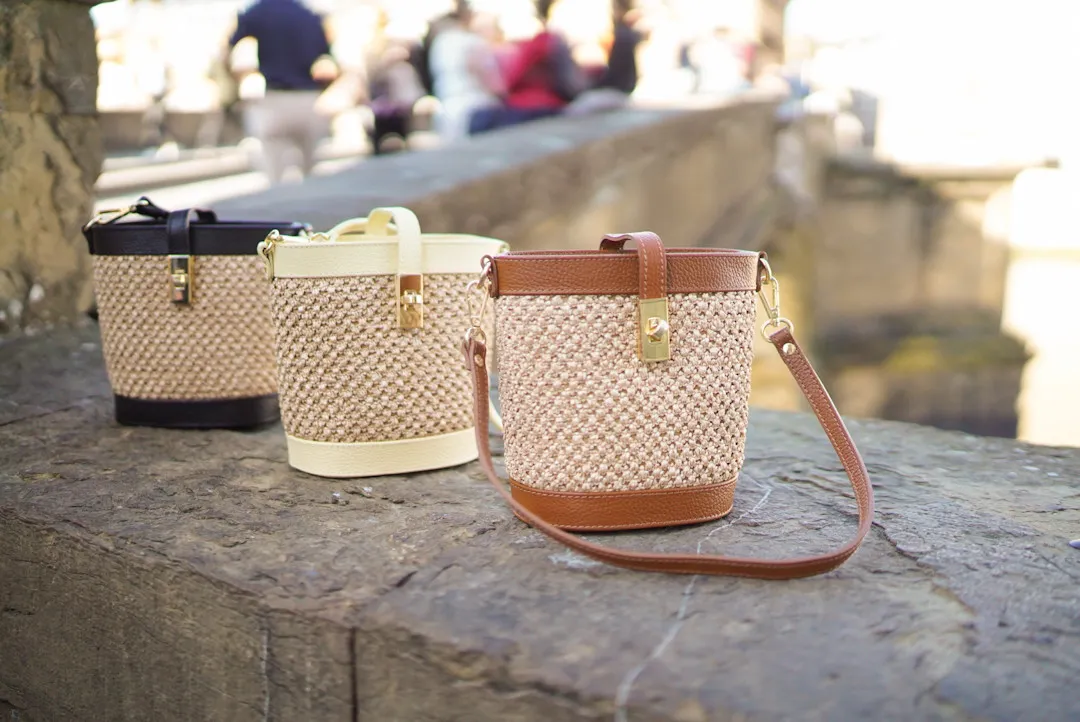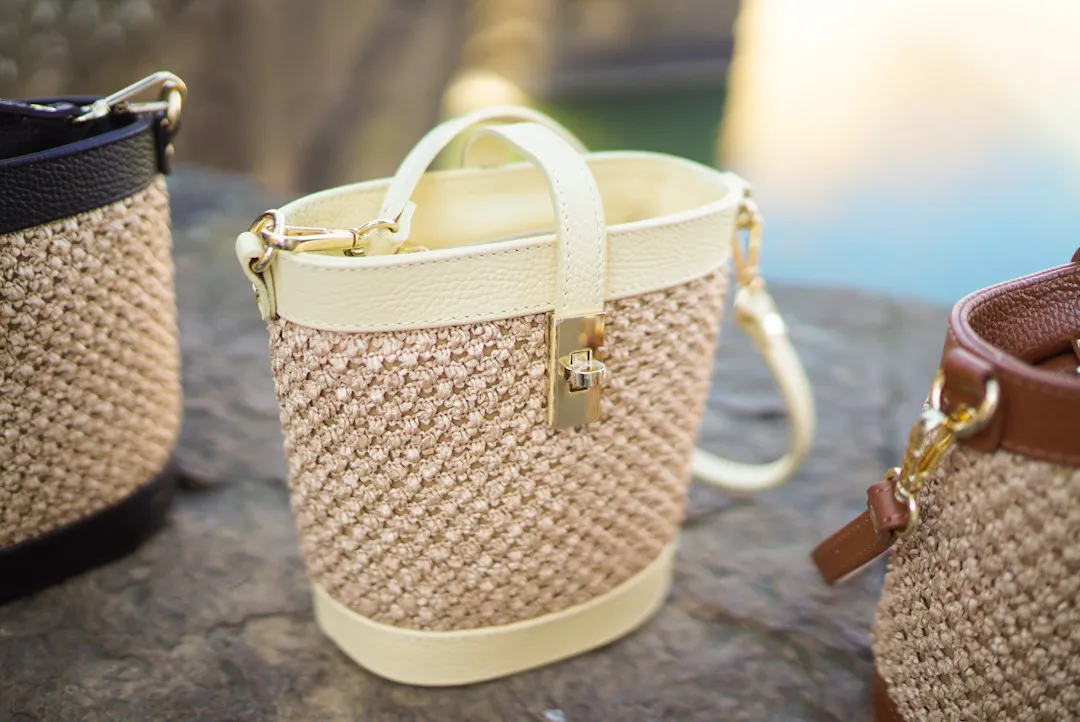 P03義大利金色轉扣真皮拼接竹編包 2480元
