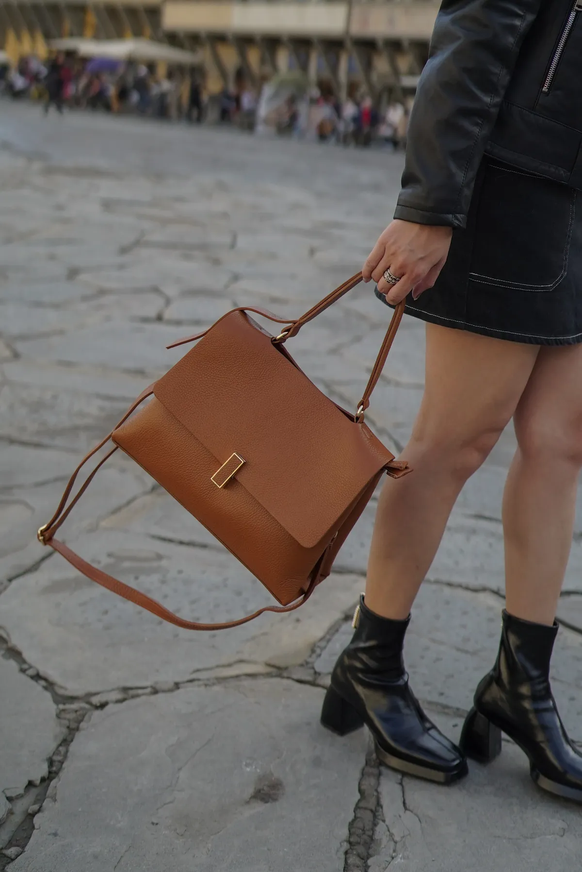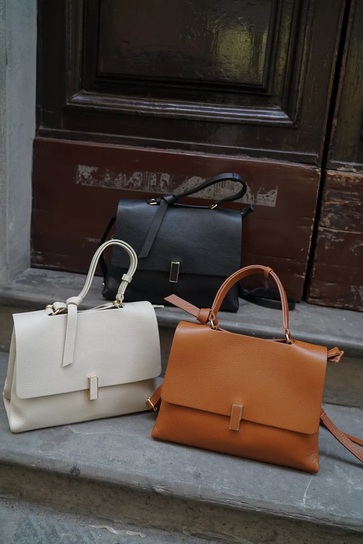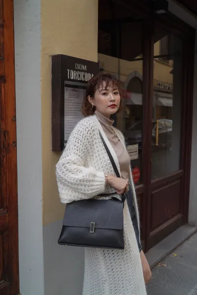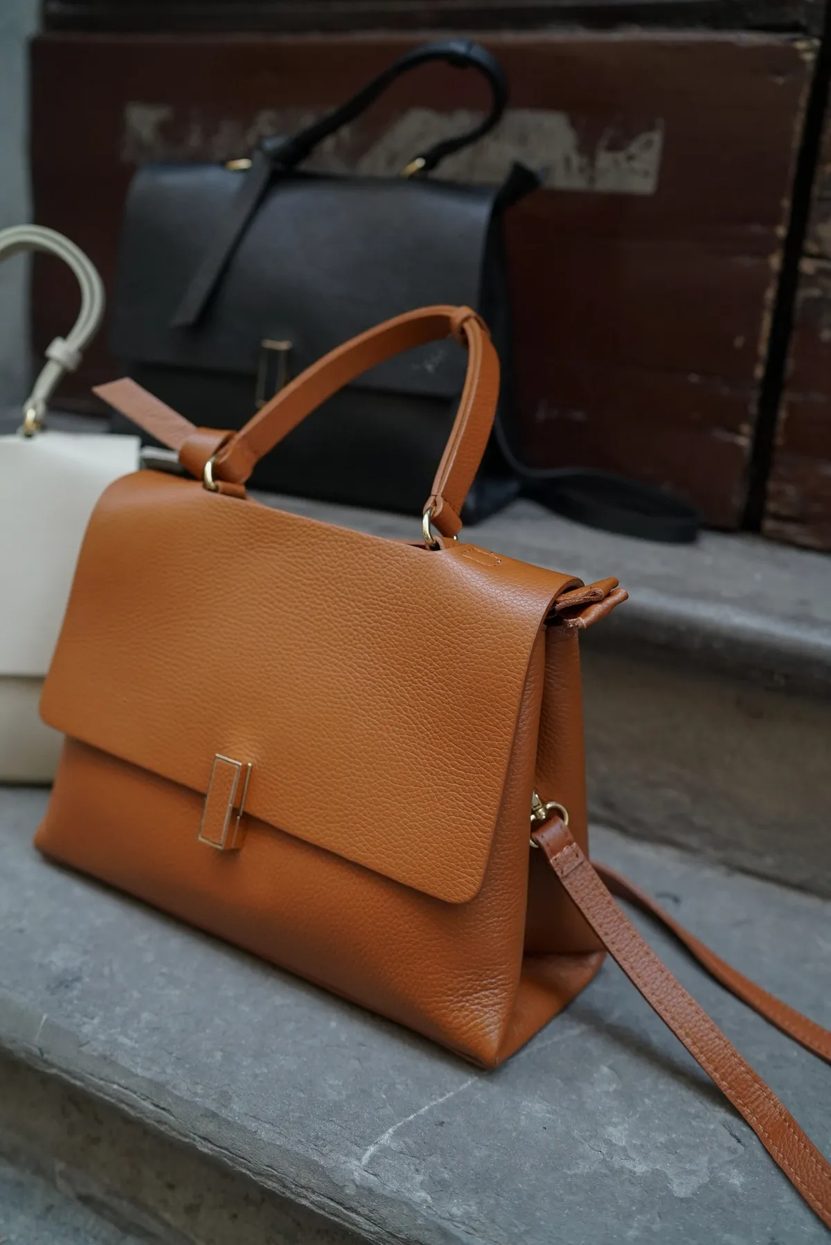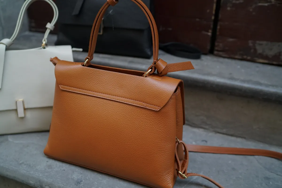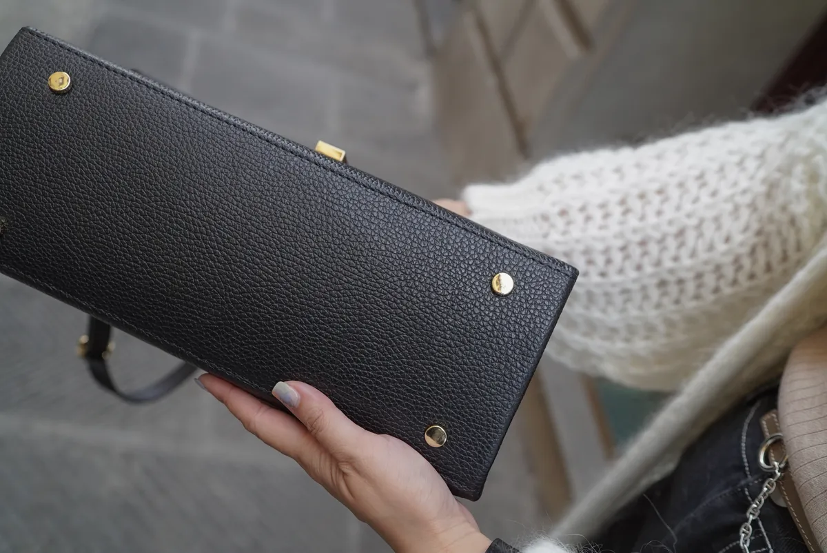 方形轉釦真皮翻蓋大手提包(附長背帶)