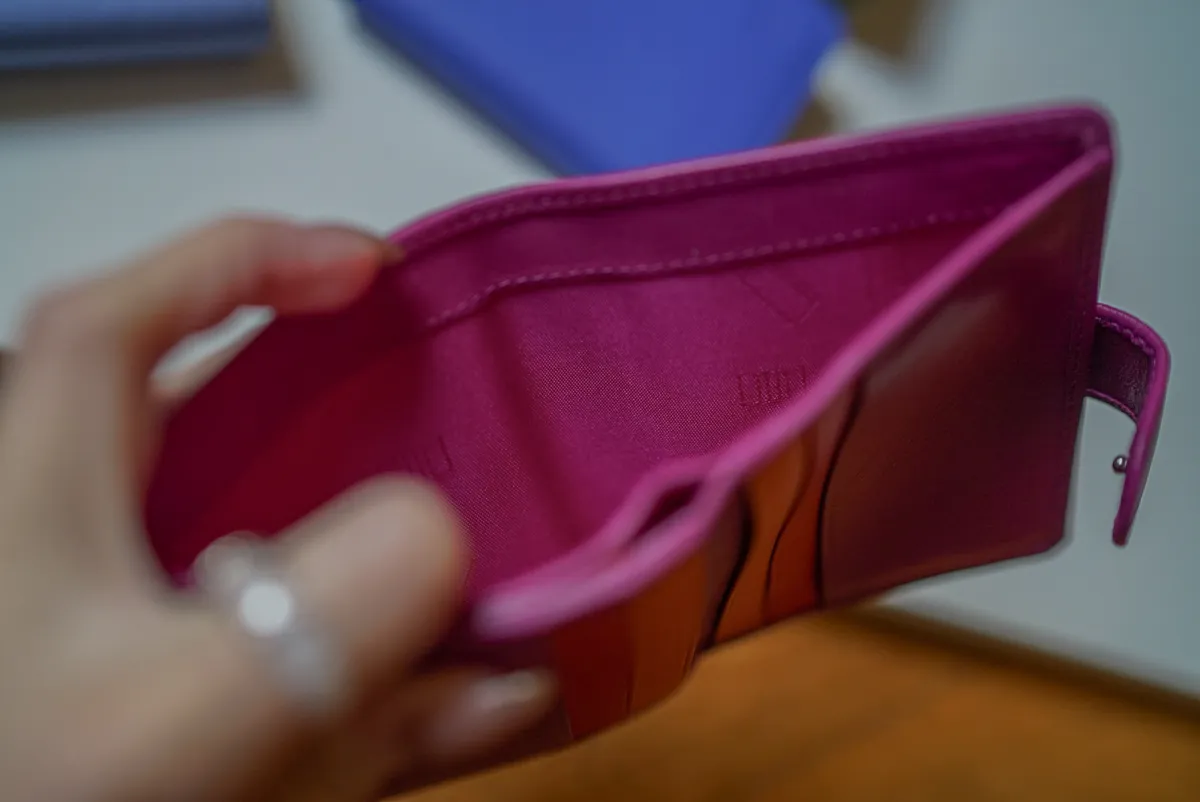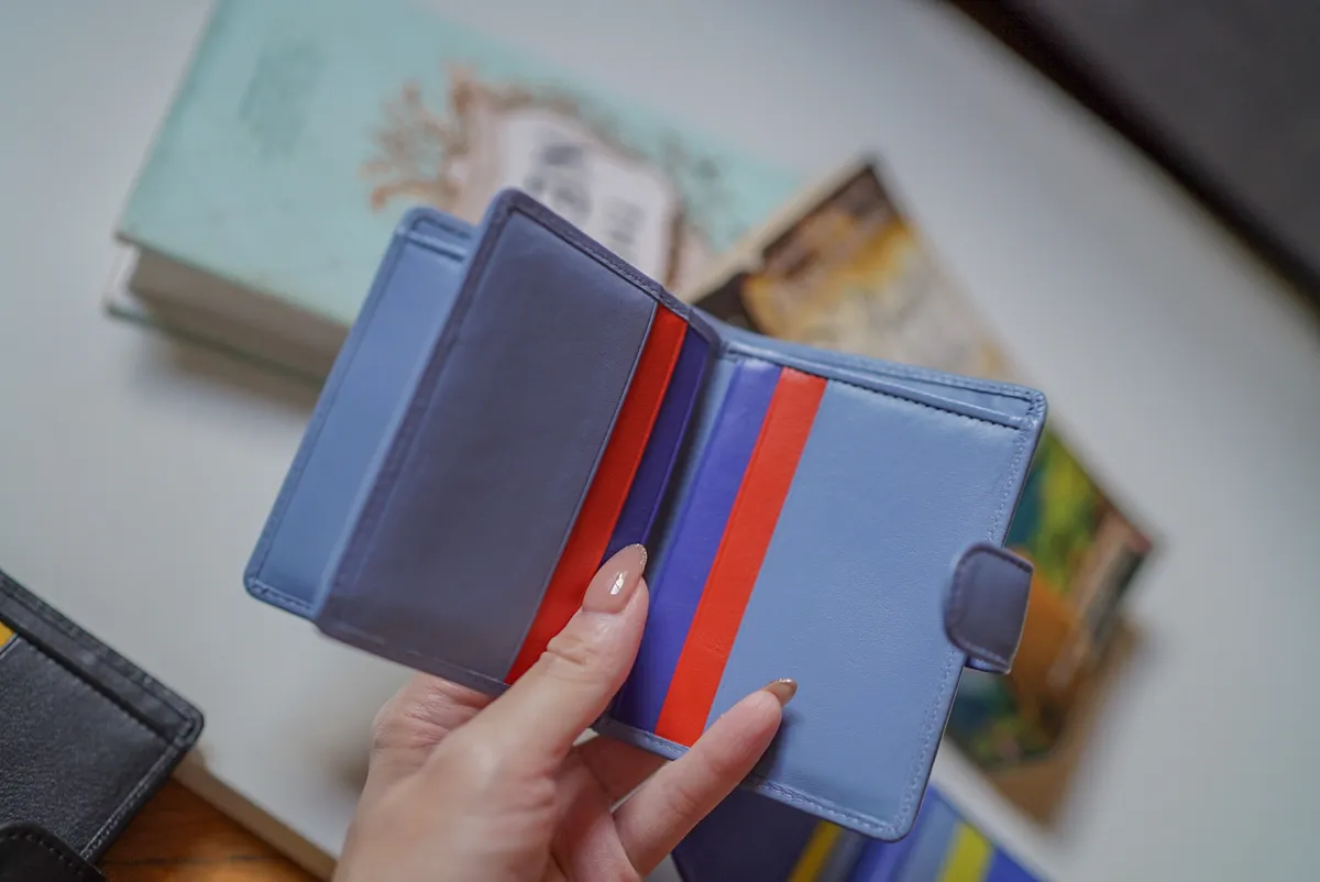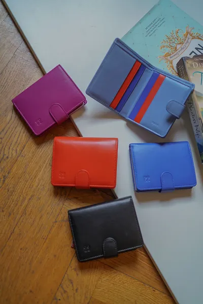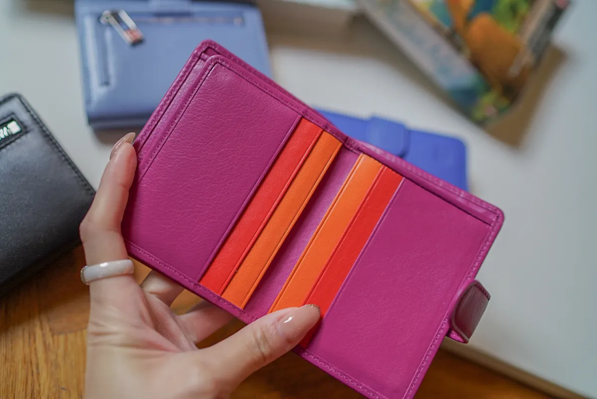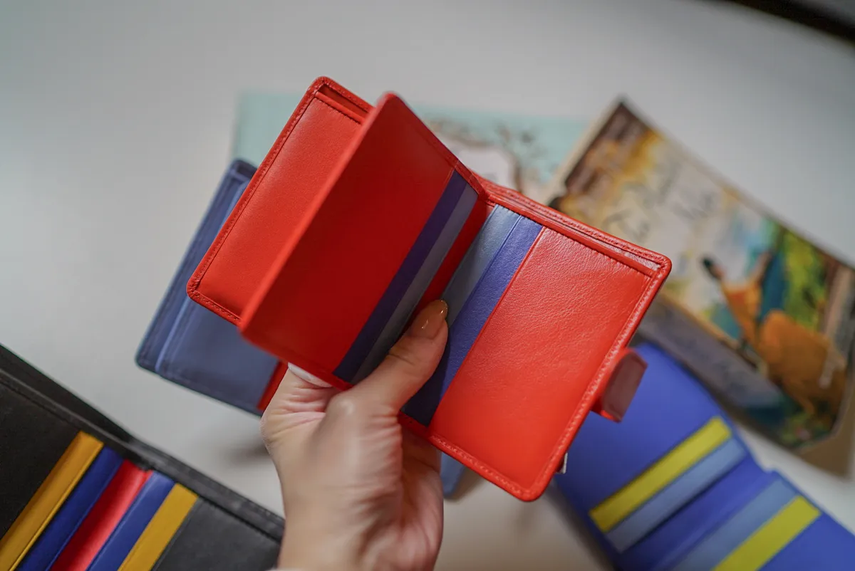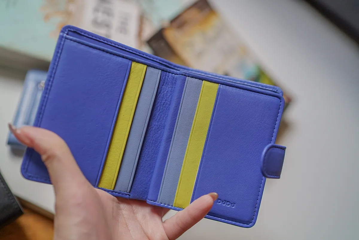 T127威尼斯品牌小牛皮翻蓋短夾 2280元 桃紫,橘,淺藍,黑,寶藍 尺寸(合上):8.5 x 11 x 1.3 cm 重量:130公克 組成:1 個帶拉鍊的外部口袋、8 個信用卡口袋、1 個鈔票口袋和 5 個額外口袋