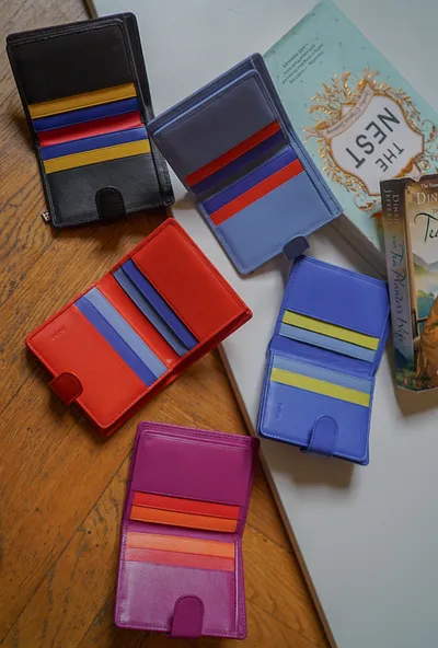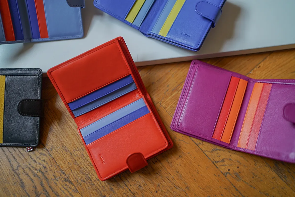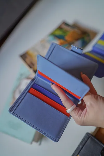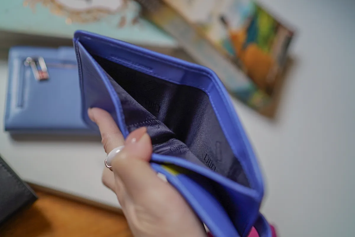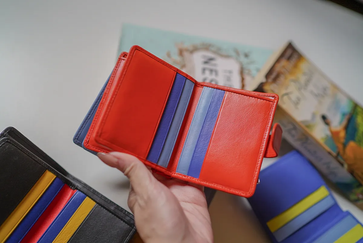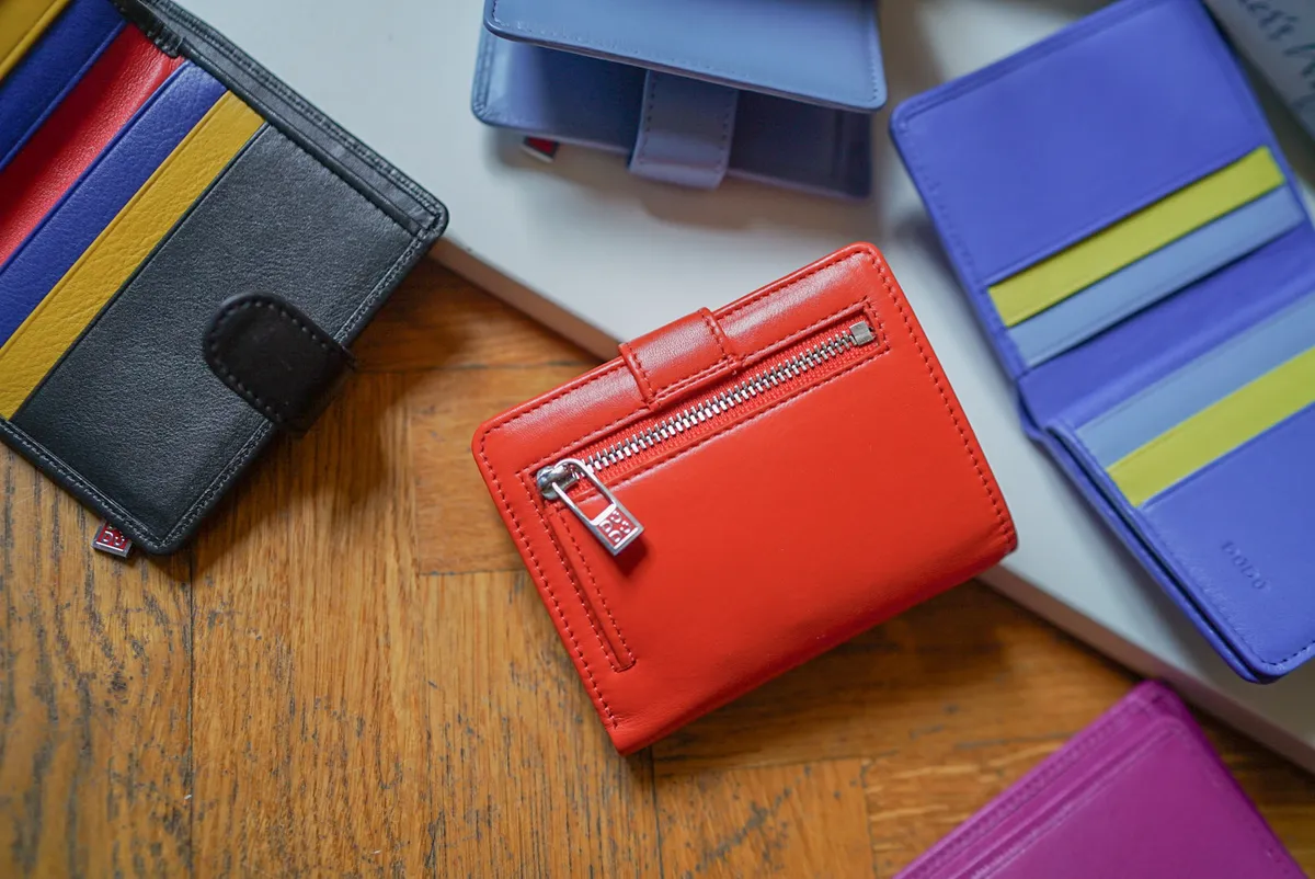 T127威尼斯品牌小牛皮翻蓋短夾 2280元 桃紫,橘,淺藍,黑,寶藍 尺寸(合上):8.5 x 11 x 1.3 cm 重量:130公克 組成:1 個帶拉鍊的外部口袋、8 個信用卡口袋、1 個鈔票口袋和 5 個額外口袋
