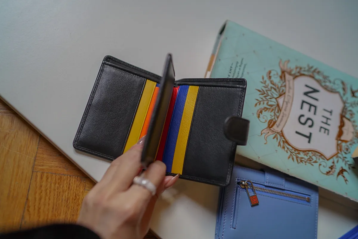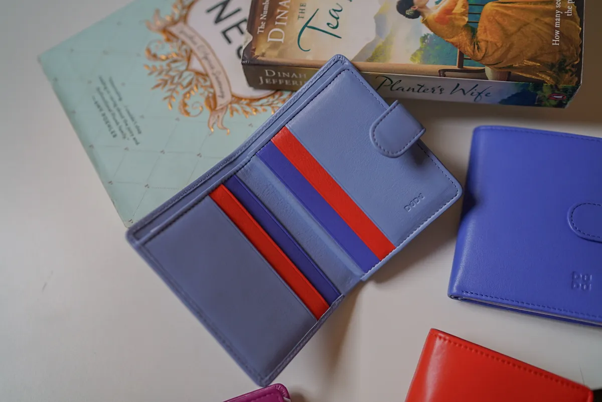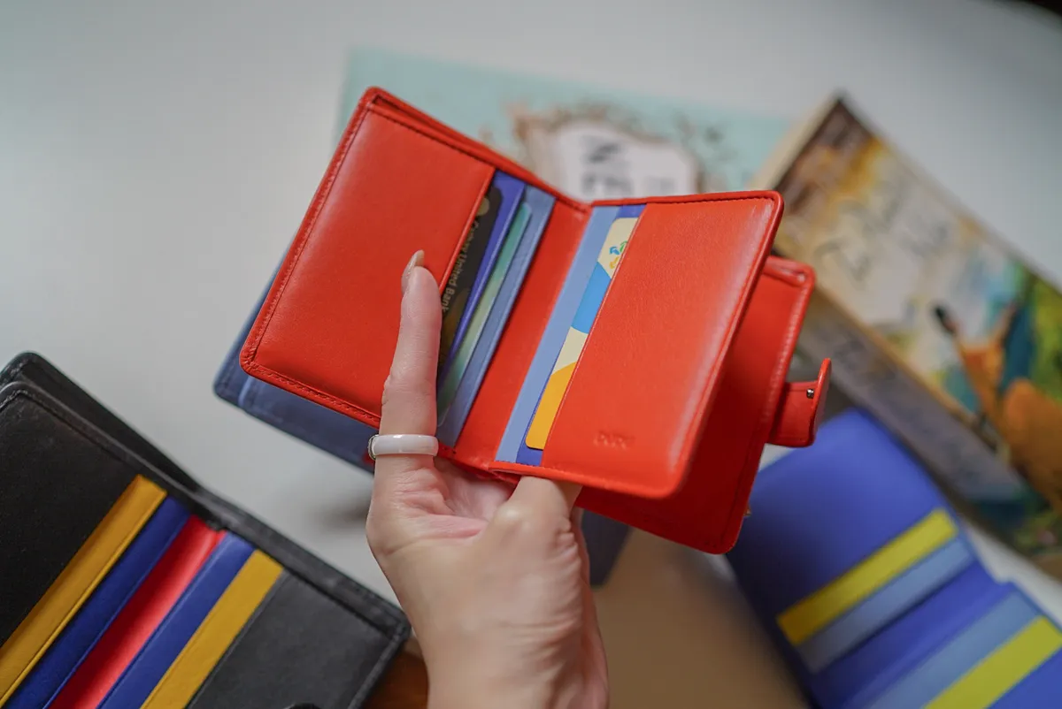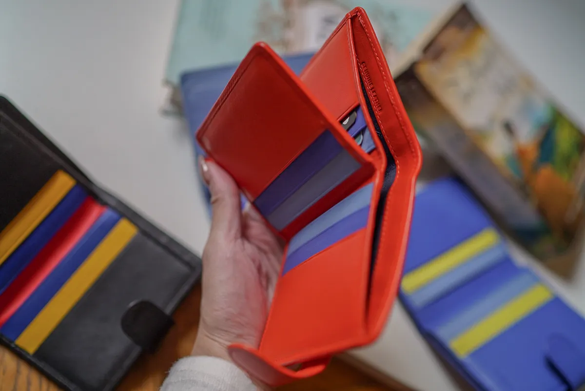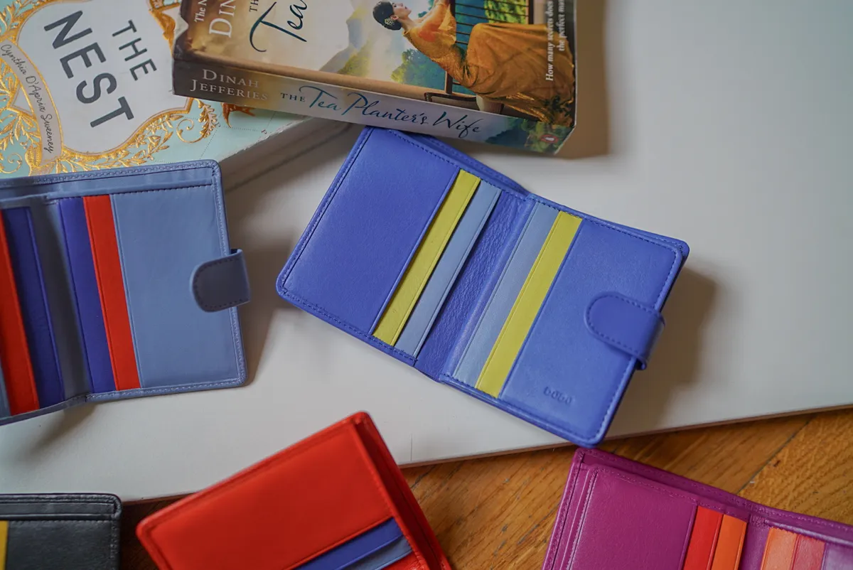 T127威尼斯品牌小牛皮翻蓋短夾 2280元 桃紫,橘,淺藍,黑,寶藍 尺寸(合上):8.5 x 11 x 1.3 cm 重量:130公克 組成:1 個帶拉鍊的外部口袋、8 個信用卡口袋、1 個鈔票口袋和 5 個額外口袋