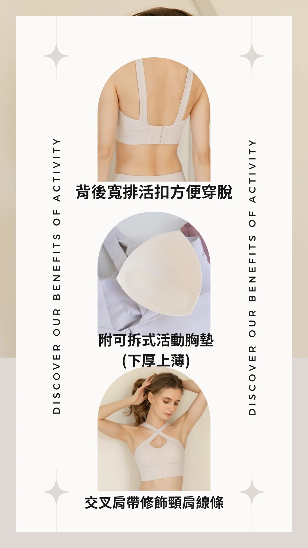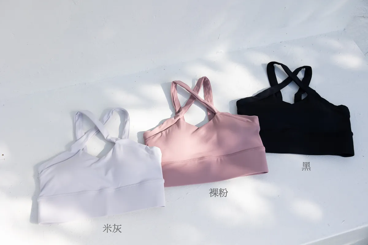🔸米灰/裸粉/黑🔸S/M/L/XL🔸附可拆式活動胸墊(下厚上薄)#側邊副乳加強包覆#交叉肩帶設計✔ 交叉肩帶設計修飾頸肩線條✔ 背後寬排活扣方便穿脫✔ 加寬底圍聚集胸型✔ 背後以X交叉寬肩帶設計給予穩定穿著感˙75%NYLON 25%ELASTANE.